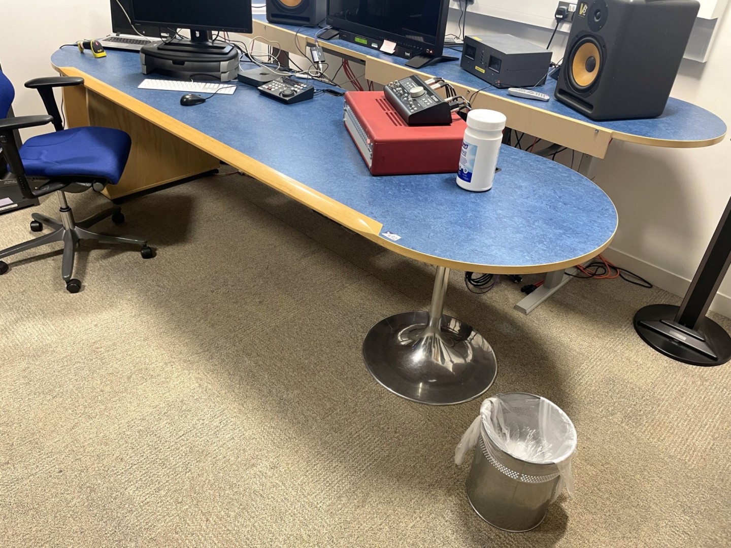 Blue 2 tier studio desk, electric RF, 2900x900mm, 2900x630mm with blue upholstered office chair (contents not included) - Lot located at: Odyssey Business Park, South Ruislip, Middlesex