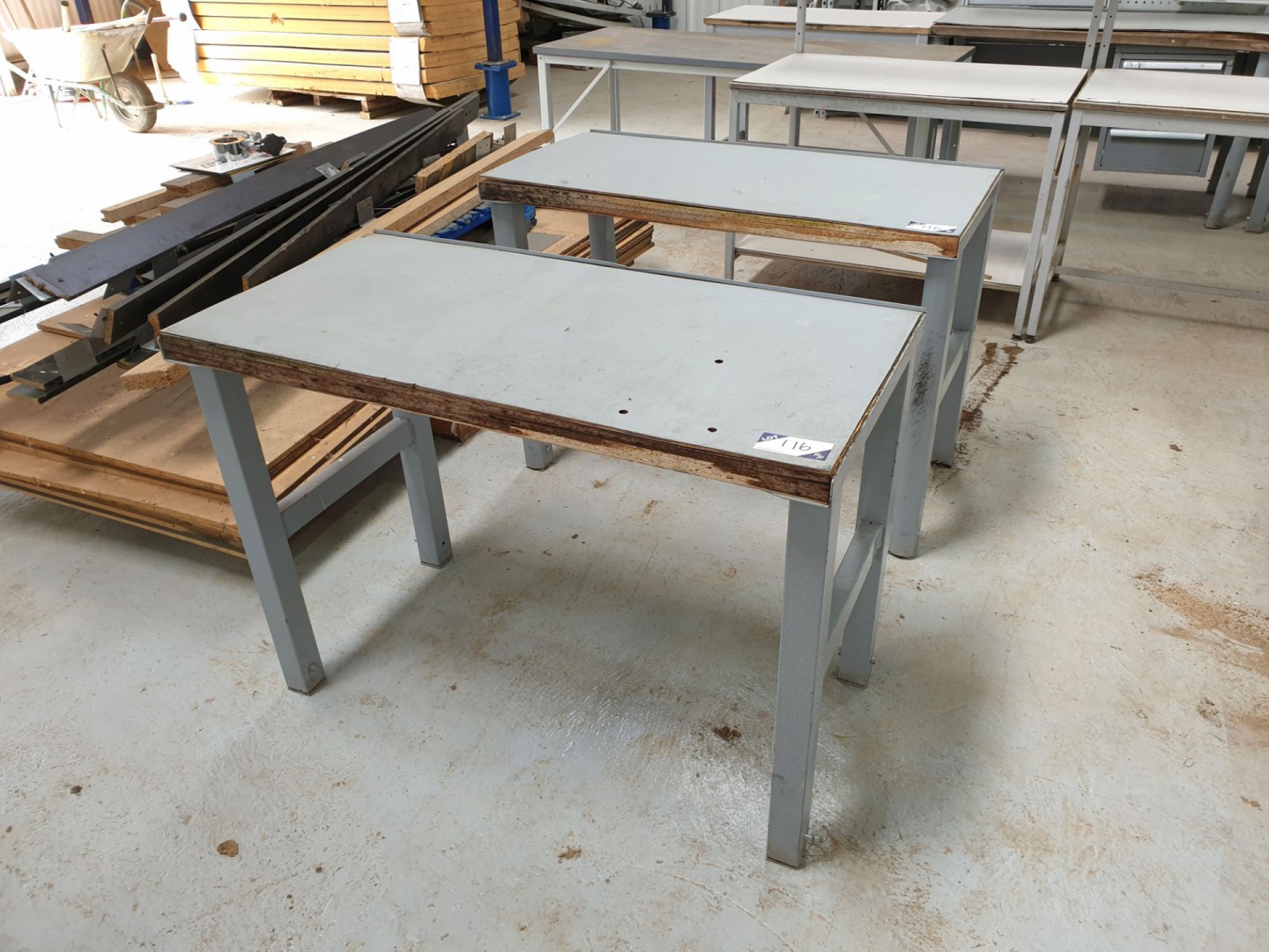2x Treston wooden top metal frame workbenches, 1200x600x870mm [some water damage to wooden top] - Lot located at: PP Saleroom, Aunby, Lincolnshire