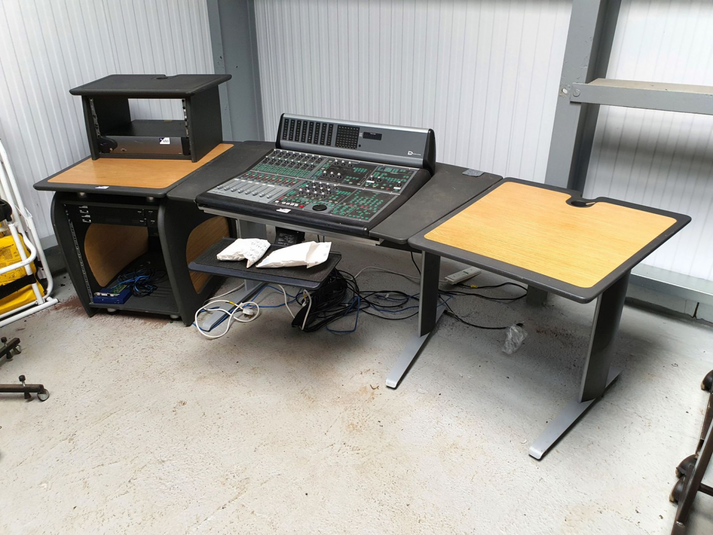 Rolec RT1 RDS receiver. Denon TU-260L precision audio component AM-FM stereo tuner. SmartView Pro KVM switch. PhoneBox GP10 interface. Betacam SP audio interface. Nicral Nica 128 dual audio codec, apt-x100. 2x Robert Leacroft control line & relay unit. Belar AS-1 audio sentry unit. Vortex Communications rack type frame inc: 4x CH-2012 amplifier modules. Audionics Ability AS2. Audionics remote matrix. Audionics rack type chassis inc: 8x 1622 input modules. Audionics Series 4 mixer console, 14 channel with cables, 3x Audionics rack type chassis inc: 14x 1272 line input modules, 1276 talkback, 1273 monitor, 1275 CF, 1129 output modules, Audionics Ability AS1, Audionics power supply etc with cables & manual. Audionics Ability AS2. Pulse Black plastic transit case. 4x Kino Flow flathead 80 studio light with 2x BAL-415 ballast, mounting bracket. Kino Flow image 80/85 DMW studio light on bracket. Kinoton FP40D digital cinema projector. Snom 760 IP phones. DigiDesign D-Command mixing console, 8 faders, PSU etc (2001) on Grey / light oak effect 3 section curved mixing desk 2500x100mm. Samsung UE32J5100AK LCD TV, bracket & remote. Qty various Kanex C247DL dual link to Apple cinema display, Apple MC8ZMB HDMI-HDMI cable (unused), Apple 10W USB power adapter, 240v cable, 2x protector pouches etc. Avid Nitris DX AVC-Intra model 7020-30008-XX external hardware accelerator. Oak / white effect studio creative edit desk, 2900x930mm (ID:0003) (dismantled). U shape oak / black effect audio studio desk, 3000x1000mm (ID:0011) (dismantled). Tascam ES-50 synchroniser, Tascam ES-51 control unit. Nikon SB-25 camera speed light. Netto 900mm cooker hood (boxed & unused). Ferguson reel to reel recorder in wooden enclosure (vintage). Grundig TK46 & TK30 reel to reel stereo recorder in carry case (vintage). Philips 4307 & 4308 reel to reel audio recorder, 4 track (vintage). 4x Yoga C-4U USB-phone plug leads, 1x Yoga C-4U USB-XLR lead (unused). Philips N8206 microphone, Grundig GDM312 microphone (vintage). Pulse PM580 dynamic vocal microphone. Philips N2220 & NN2205 cassette recorder, PYE 9115 cassette recorder (vintage) etc