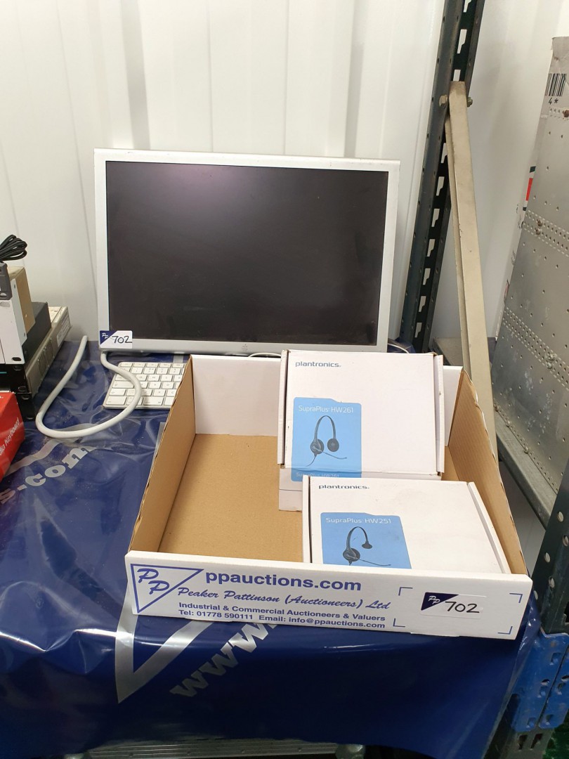 Apple A1081 monitor, keyboard (no stand), 2x Plantronics Supra Plus HW261 headsets (boxed) - lot located at: PP Saleroom, Aunby, Lincolnshire