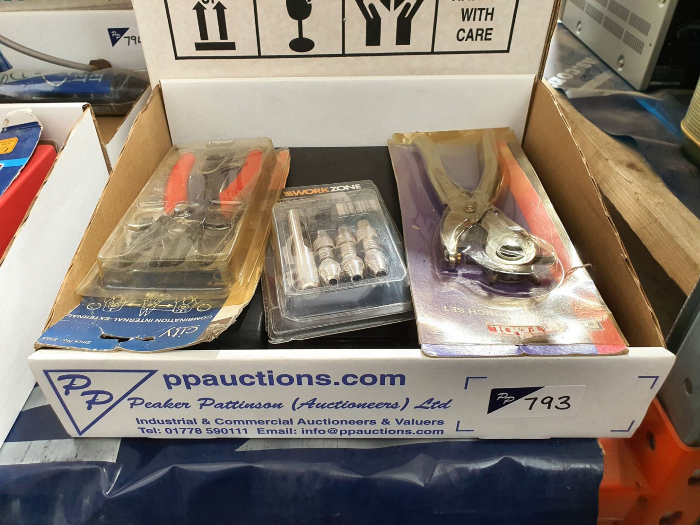 Workzone 7 piece hole punch set, city internal-external snap ring pliers, Duratool leather punch set, RS 193-966 crimping set in carry case - lot located at: PP Saleroom, Aunby, Lincolnshire