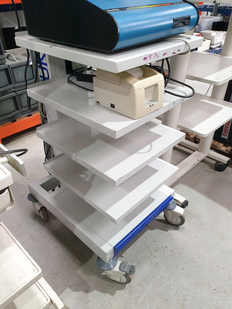 Barco MDNC-3121 monitor with PSU (2011). Qty various Medicart International etc mobile multi tier equipment trollies. Technidyne Colour Touch 2 spectrophotometer with Star TSP 650 printer. Meditronic Fusion ENT image guidance system on mobile trolley. 2x Natus enoblue cozy LED phototherapy. Medela 038.3021 BilliBed. Olympus TI-1900 imaging trolley. Gastec GV-100 gas sampling pump. Avid 0020-00365-01 video sync frame