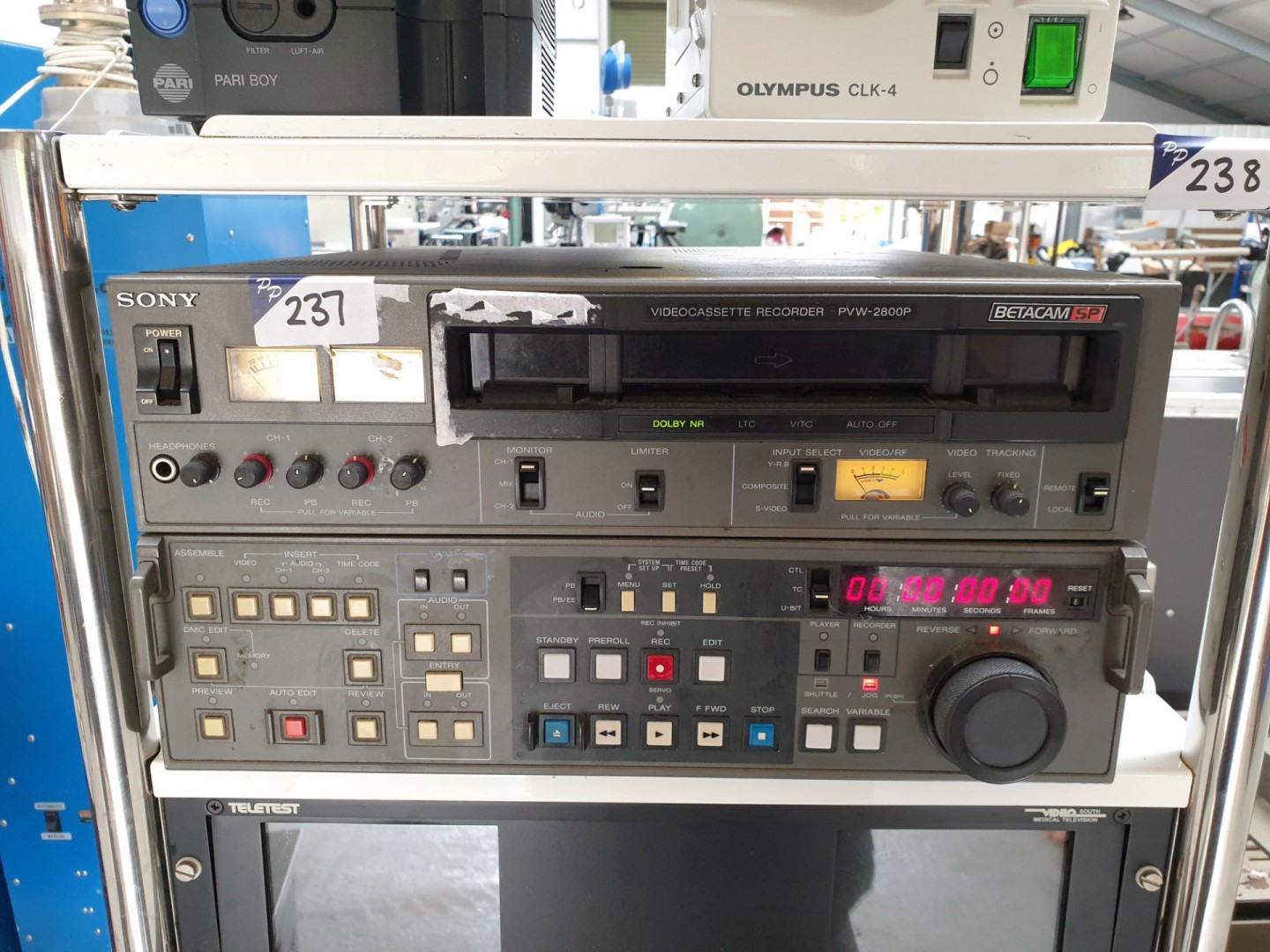 Fisher & Paykel / G Rutler nerve stimulators. Sony DNW-A22P & Sony DNW-A30P digital video cassette players. 2x Pariboy respirators. Olympus CLK-4 light source. Sony PVW-2800P video cassette recorder.