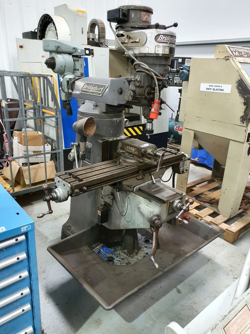 Bridgeport belt head turret mill, 42x9” table, pow...