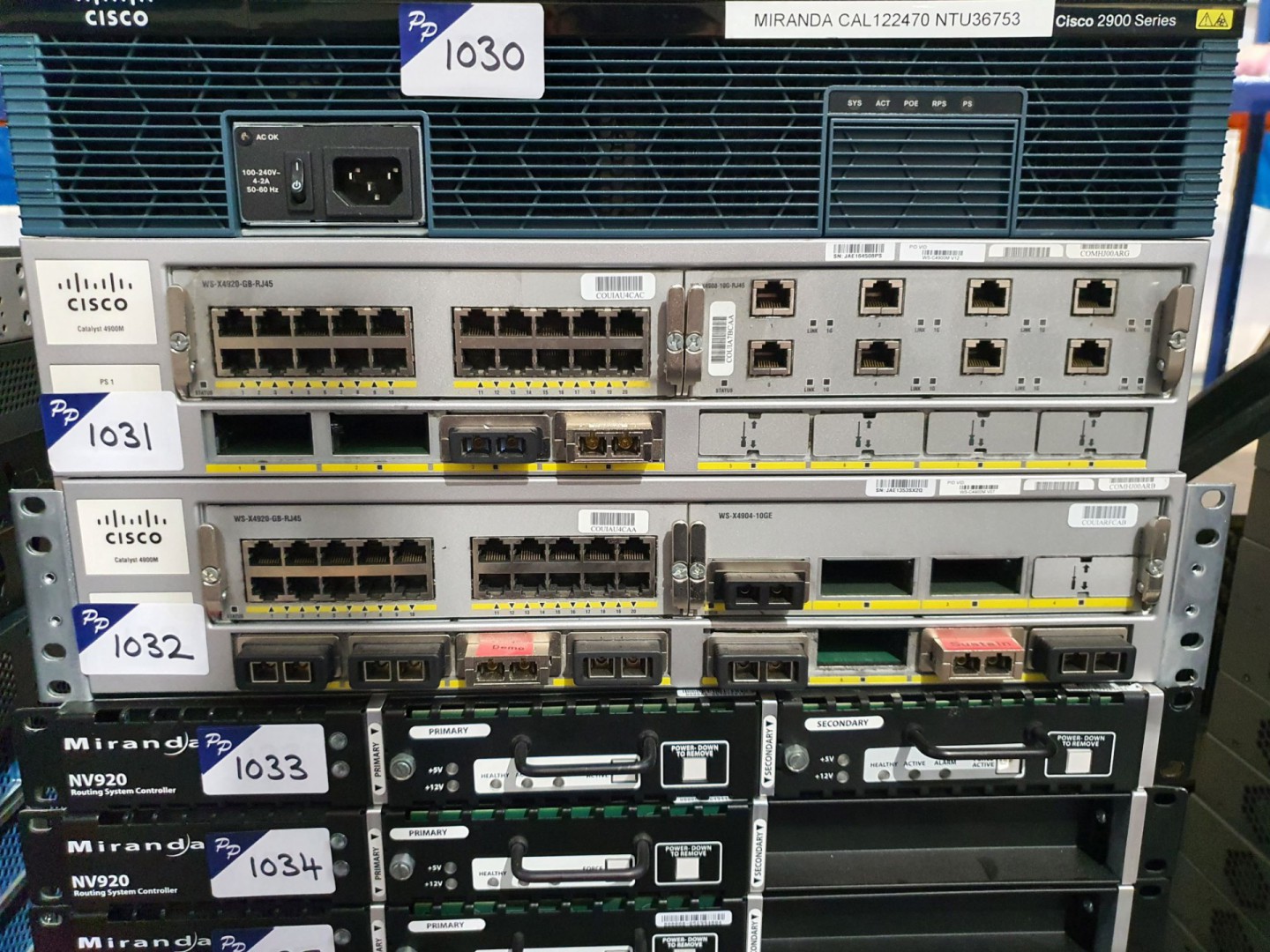 Kingfisher K127010-ING-APC optical loss test set. Exfo Fibre Basix EPM-50 power meter. Exfo QST-50C module. Sunrise Telecom Sunset MTT handset. SSMTT-28 Ethernet module. Unipro Gbis DSL tester. Flann Microwave 15110 rotary attenuator. HP 37717C communications performance analyser. Fujikura 12s fusion splicer. JDSU PowerChek optical power meter. 4x JDSU PowerChek optical power meter. 2x JDSU QT-600-02 Ethernet test head. JDSU Viavi MAP-200 multiple application platform (2019). Allied Telesyn AT-MC13 Ethernet media converter. Snell & Wilcox VDA12 video distribution amplifier. 2x Miranda DXF-Tray with Miranda DXF-200RX & DXF-200-TF modules. Blackmagic Design Teranex Mini 12G-SDI to Quad SDI converters. Sam Kahuna 9600 & 360 Format Fusion 3 Production Switcher frames. Blackmagic Broadcast Videohub, 72x72 router. Snell & Wilcox CPP100 compression pre-processor. Snell & Wilcox HD Source HD test pattern generator. Snell & Wilcox Quasar Ph.C motion compensated up converter. Miranda Kaleido X16-D dual head multiviewer (2011). 2x Farnell L12-10C power supply. Tacima SC5470 auto transformer. Sony PVV-3P video recorder, Sony DXC-637P video camera. Flanders Scientific LM-2461W 24” broadcast monitor (2011). Panasonic AJ-SD955 digital video recorder. Qty various Tektronix WFM 601 serial component monitors. Leader LV5152DA waveform monitor. Qty Snell Kahuna HYS72D128300HBR-6-B 1GB memory modules. Cisco Catalyst 4900M WS-X network switch. Grass Valley K2-Solo-MPEG media server (2016). Grass Valley IQ Modular Infrastructure frame. Grass Valley SQ2000 livetouch frame. Grass Valley K2 Summit 3G Production Client (2015). Grass Valley IP Masterpiece Master Control IP vision mixer. Grass Valley GVC-Controller-800 GV convergent server (2019). Grass Valley GVSP-3TB-WIN-810 ITX server (2017). Aerohive AH-APPLIANCE-1 network switch (boxed). 2x AJA Kona 4, 16 channel with cable & card. Miranda Xmedia server. Snell & Wilcox QC station DVB receiver. Snell & Wilcox IQ Modular Roll Call frame. SAM Vega frame. Sam Quantel Pablo Rio 747-16 media server. Cisco SG500XG-8F8T 10Gigabit switch. Cisco SG500X-48 48 port switch.