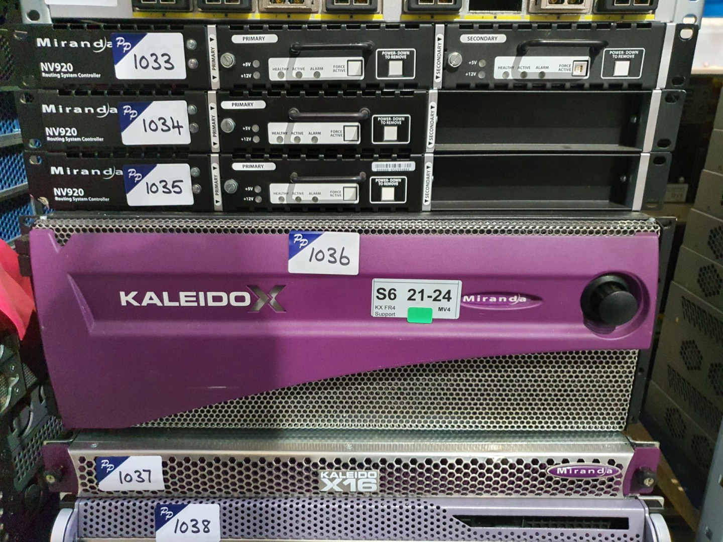 Voltech PM1000 AC power analyser. RS Testo 440 vane probe anemometer. Astro SL-7036 sync generator. Cobalt HD8024 HD / SD format converter. Purex filter fume extractors. Grass Valley DD external power supply. Gefen A/V cinema scalar Pro II Omneon Media decks. Miranda CR3232-AV audio video router. AJA KiPro rack disk recorder. RS Seaward PAT1000S PAT tester. Quantel Pablo Neo 4K paint & graphics controller. SAM IQ Edge chassis. Quantum Scalar i80 tape library. SAM Quantel Rio. ProBel Morpheus integrated content engines. Quantel 2116 platform units. Grass Valley K Frame video production centre. Grass Valley & Snell Sirus 600, 830 & 840 chassis / routers. Miranda NVision NV5100MC multichannel master control switcher. Snell & Wilcox Kahuna SD/HD production switchers. AJA Kumo Compact Sdi router. Arri 650Plus studio lights. 4x Sony PVM-9042QM composite CRT studio monitors. JVC TM1010 & TM1051D composite / component studio CRT monitors. Ikegami PM404 B&W CRT monitors. Sony BVM-D14HSE grade 1 studio CRT monitors. Vutrix 24HR quad LCD monitors. Tascam DA-78 8 track digital audio multitrack recorder. RME ADI-6432 bi-directional Madi to AES converter. RME Octamic Mic Pre & PSU. 2x Axon frames with plug in cards. RTS Telex comms system. Snell & Wilcox video router system. For-a HVS 350 vision mixer system. Snell & Wilcox Kahuna vision mixer system. Miranda audio bridge terminal. Nvidia Tesla, Nvidia Quadro etc graphic cards. Sony LMD-2020 LCD monitor. Meynell isolating transformers. SRM 100/3 surface resistivity / resistance meter. AJA HD10AVA dual rate HD / SD audio video A/D converter. Rubidium Series 1 universal video data processor. AJA CRV88-9-S-NCI Corvid 88 multi-stream, multi-format PCIe I/O card. AJA CRV44-S-NCI Corvid 44 flexible multi-format I/O card, etc etc.