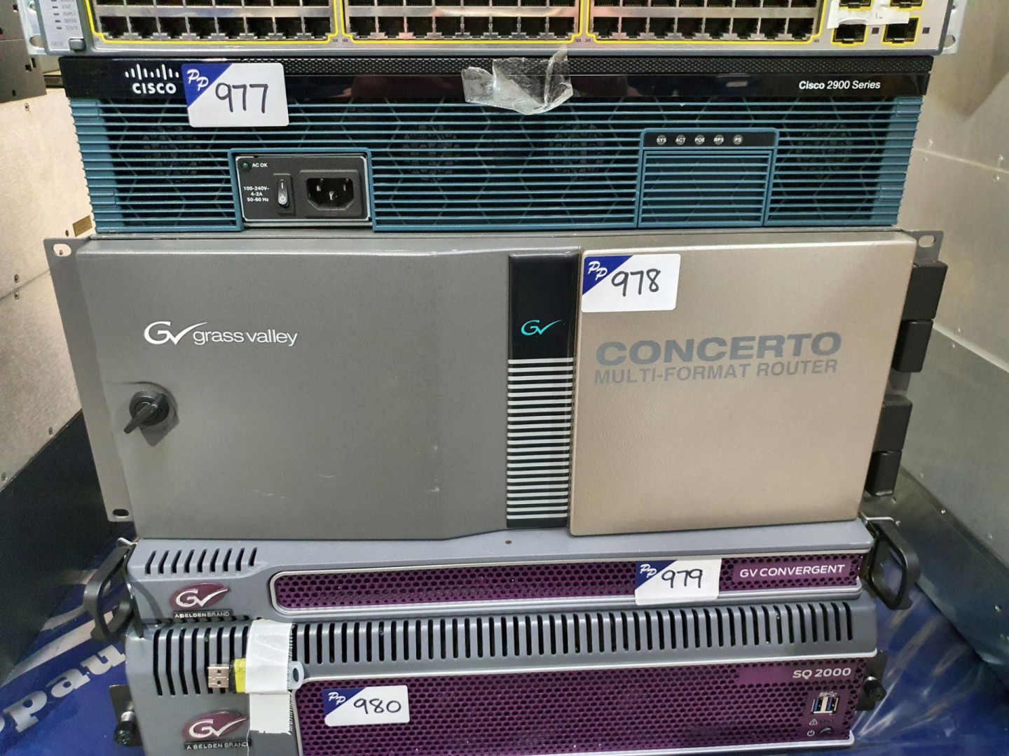 Kingfisher K127010-ING-APC optical loss test set. Exfo Fibre Basix EPM-50 power meter. Exfo QST-50C module. Sunrise Telecom Sunset MTT handset. SSMTT-28 Ethernet module. Unipro Gbis DSL tester. Flann Microwave 15110 rotary attenuator. HP 37717C communications performance analyser. Fujikura 12s fusion splicer. JDSU PowerChek optical power meter. 4x JDSU PowerChek optical power meter. 2x JDSU QT-600-02 Ethernet test head. JDSU Viavi MAP-200 multiple application platform (2019). Allied Telesyn AT-MC13 Ethernet media converter. Snell & Wilcox VDA12 video distribution amplifier. 2x Miranda DXF-Tray with Miranda DXF-200RX & DXF-200-TF modules. Blackmagic Design Teranex Mini 12G-SDI to Quad SDI converters. Sam Kahuna 9600 & 360 Format Fusion 3 Production Switcher frames. Blackmagic Broadcast Videohub, 72x72 router. Snell & Wilcox CPP100 compression pre-processor. Snell & Wilcox HD Source HD test pattern generator. Snell & Wilcox Quasar Ph.C motion compensated up converter. Miranda Kaleido X16-D dual head multiviewer (2011). 2x Farnell L12-10C power supply. Tacima SC5470 auto transformer. Sony PVV-3P video recorder, Sony DXC-637P video camera. Flanders Scientific LM-2461W 24” broadcast monitor (2011). Panasonic AJ-SD955 digital video recorder. Qty various Tektronix WFM 601 serial component monitors. Leader LV5152DA waveform monitor. Qty Snell Kahuna HYS72D128300HBR-6-B 1GB memory modules. Cisco Catalyst 4900M WS-X network switch. Grass Valley K2-Solo-MPEG media server (2016). Grass Valley IQ Modular Infrastructure frame. Grass Valley SQ2000 livetouch frame. Grass Valley K2 Summit 3G Production Client (2015). Grass Valley IP Masterpiece Master Control IP vision mixer. Grass Valley GVC-Controller-800 GV convergent server (2019). Grass Valley GVSP-3TB-WIN-810 ITX server (2017). Aerohive AH-APPLIANCE-1 network switch (boxed). 2x AJA Kona 4, 16 channel with cable & card. Miranda Xmedia server. Snell & Wilcox QC station DVB receiver. Snell & Wilcox IQ Modular Roll Call frame. SAM Vega frame. Sam Quantel Pablo Rio 747-16 media server. Cisco SG500XG-8F8T 10Gigabit switch. Cisco SG500X-48 48 port switch.