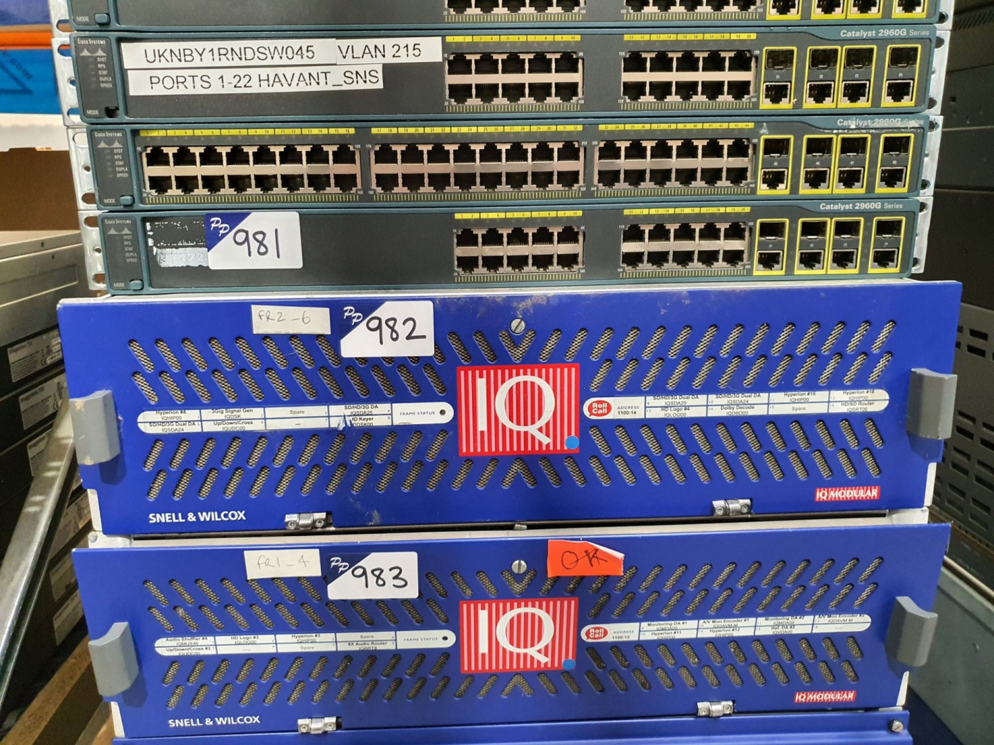 Kingfisher K127010-ING-APC optical loss test set. Exfo Fibre Basix EPM-50 power meter. Exfo QST-50C module. Sunrise Telecom Sunset MTT handset. SSMTT-28 Ethernet module. Unipro Gbis DSL tester. Flann Microwave 15110 rotary attenuator. HP 37717C communications performance analyser. Fujikura 12s fusion splicer. JDSU PowerChek optical power meter. 4x JDSU PowerChek optical power meter. 2x JDSU QT-600-02 Ethernet test head. JDSU Viavi MAP-200 multiple application platform (2019). Allied Telesyn AT-MC13 Ethernet media converter. Snell & Wilcox VDA12 video distribution amplifier. 2x Miranda DXF-Tray with Miranda DXF-200RX & DXF-200-TF modules. Blackmagic Design Teranex Mini 12G-SDI to Quad SDI converters. Sam Kahuna 9600 & 360 Format Fusion 3 Production Switcher frames. Blackmagic Broadcast Videohub, 72x72 router. Snell & Wilcox CPP100 compression pre-processor. Snell & Wilcox HD Source HD test pattern generator. Snell & Wilcox Quasar Ph.C motion compensated up converter. Miranda Kaleido X16-D dual head multiviewer (2011). 2x Farnell L12-10C power supply. Tacima SC5470 auto transformer. Sony PVV-3P video recorder, Sony DXC-637P video camera. Flanders Scientific LM-2461W 24” broadcast monitor (2011). Panasonic AJ-SD955 digital video recorder. Qty various Tektronix WFM 601 serial component monitors. Leader LV5152DA waveform monitor. Qty Snell Kahuna HYS72D128300HBR-6-B 1GB memory modules. Cisco Catalyst 4900M WS-X network switch. Grass Valley K2-Solo-MPEG media server (2016). Grass Valley IQ Modular Infrastructure frame. Grass Valley SQ2000 livetouch frame. Grass Valley K2 Summit 3G Production Client (2015). Grass Valley IP Masterpiece Master Control IP vision mixer. Grass Valley GVC-Controller-800 GV convergent server (2019). Grass Valley GVSP-3TB-WIN-810 ITX server (2017). Aerohive AH-APPLIANCE-1 network switch (boxed). 2x AJA Kona 4, 16 channel with cable & card. Miranda Xmedia server. Snell & Wilcox QC station DVB receiver. Snell & Wilcox IQ Modular Roll Call frame. SAM Vega frame. Sam Quantel Pablo Rio 747-16 media server. Cisco SG500XG-8F8T 10Gigabit switch. Cisco SG500X-48 48 port switch.