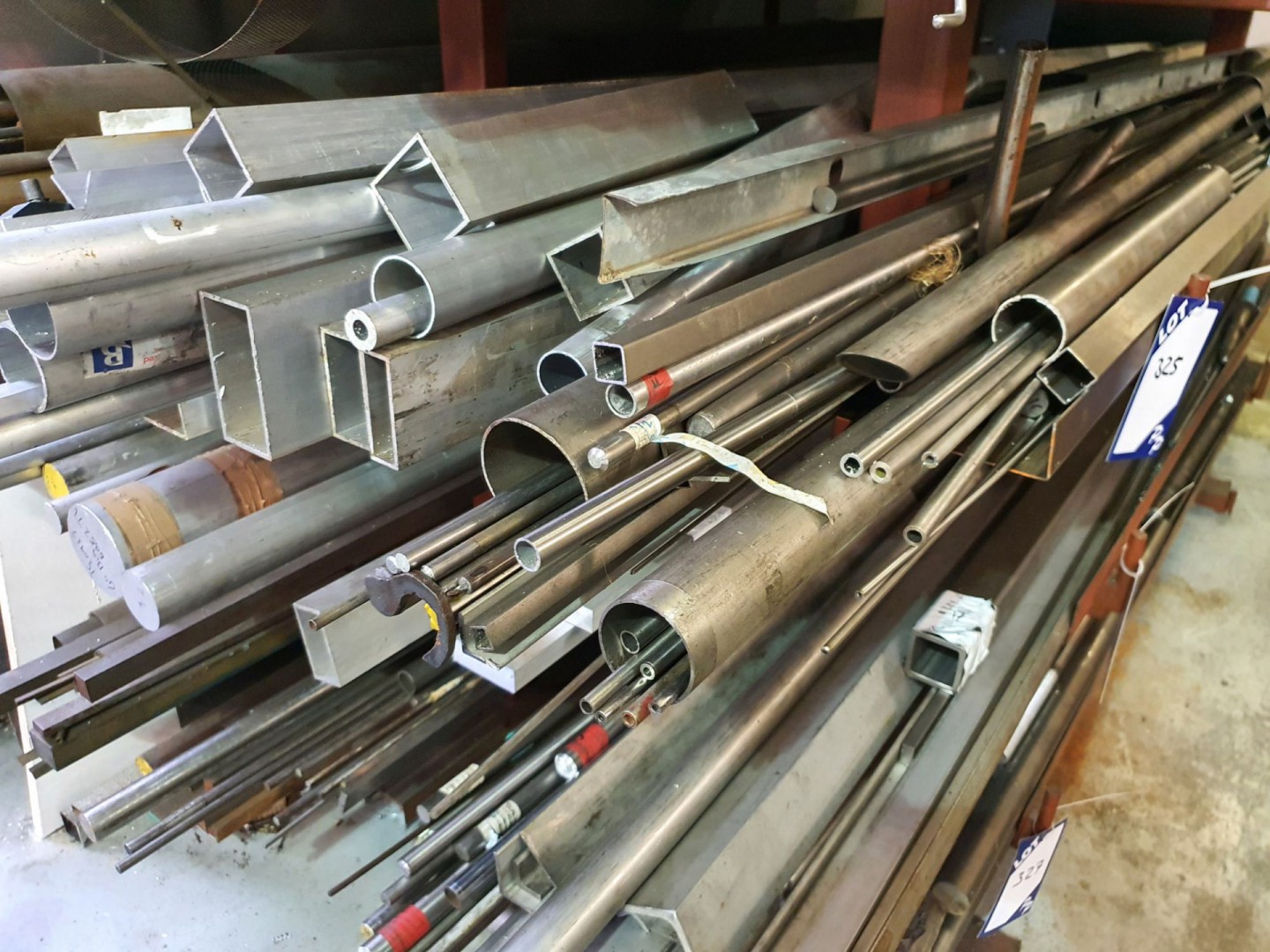 Qty various steel, aluminium & brass tubes, bars & box section to 5" dia, 3400mm length approx
