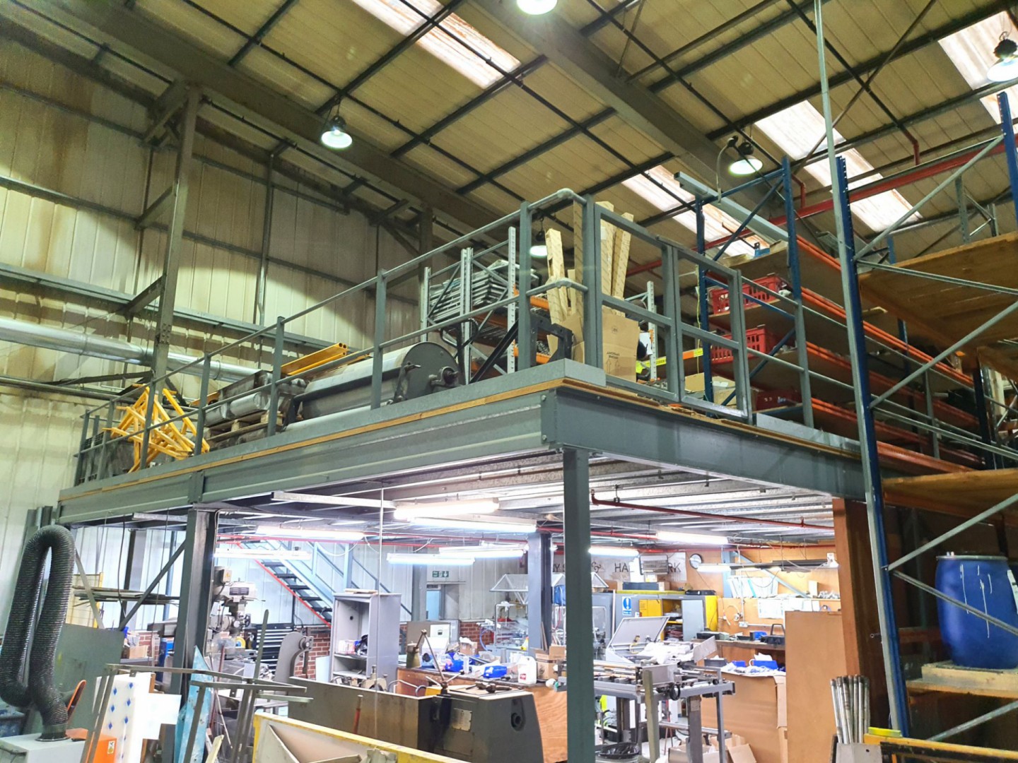 9x9m approx floor standing mezzanine floor with staircase, 3000mm high floor level, handrails, lights