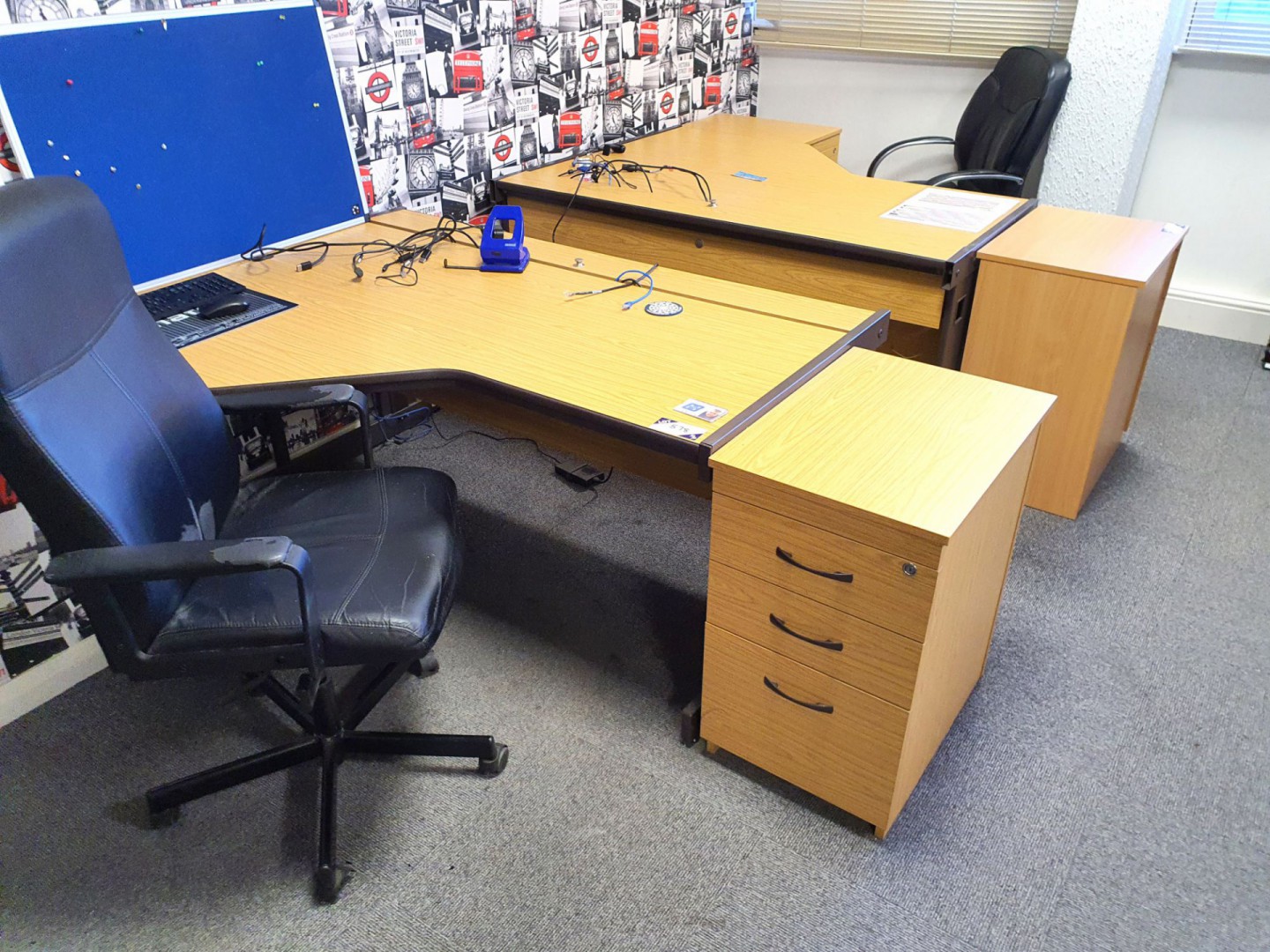 2x oak effect L-shape office desks, 1600x1200mm, 3x oak effect 3 drawer pedestal units