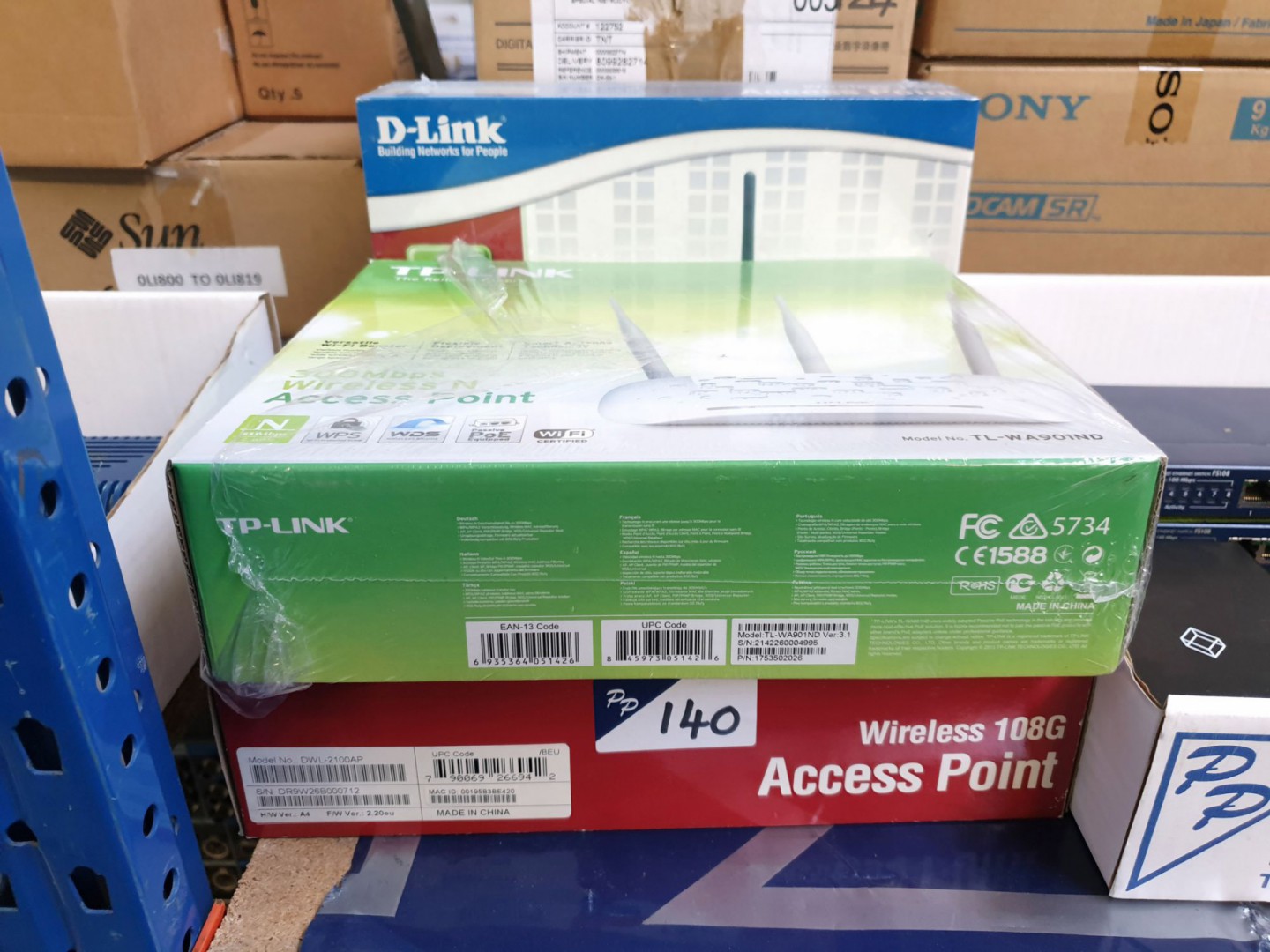 TP-Link TL-WA909ND Wi-Fi booster (boxed), 2x D-Link wireless 108G access points (boxed)