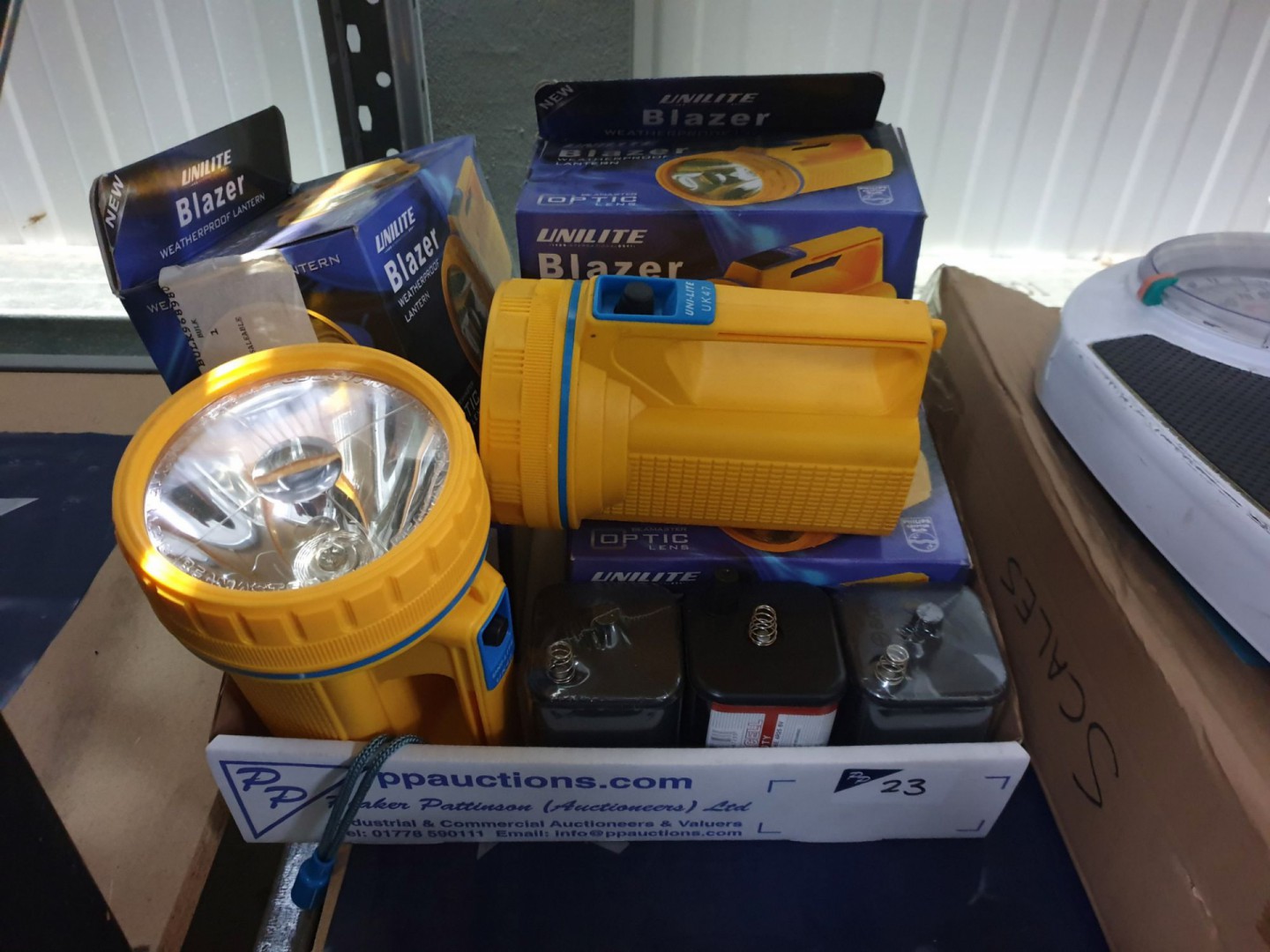 4x RS 579-326 rechargeable torches. EKS 830/3572(D) weighing scales, 24st / 150kg cap