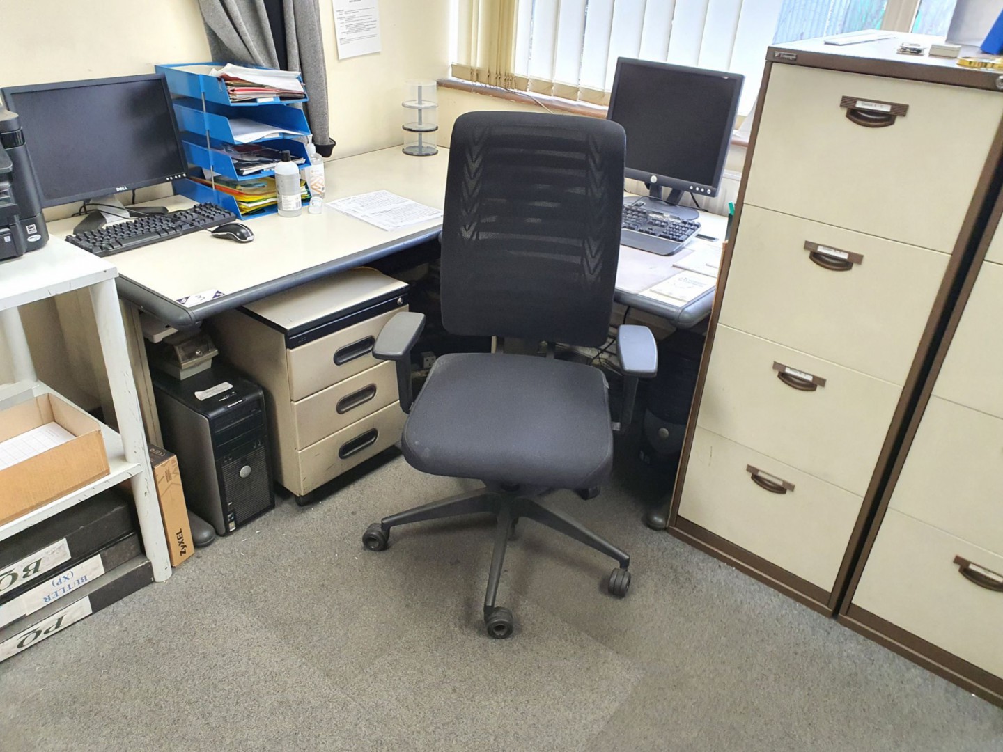 Contents of office inc: 3x various office desks, 4 drawer filing cabinets, upholstered chairs etc (IT equipment to be removed)