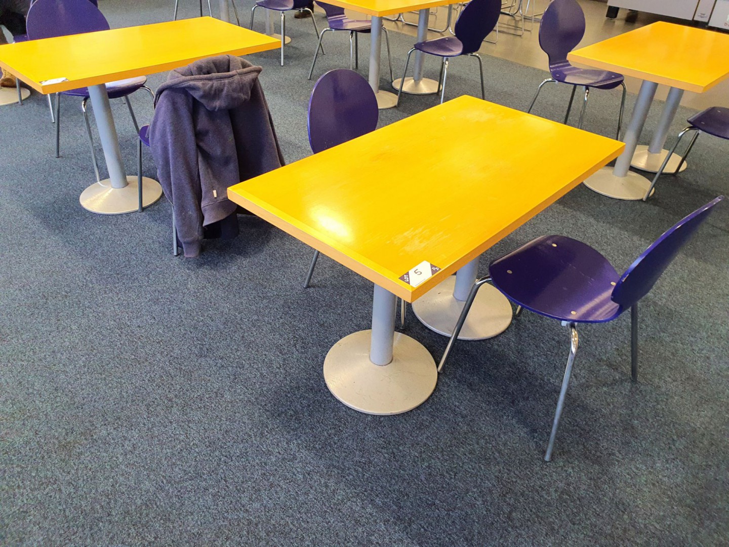 3x light oak effect canteen tables, 1115x650mm inc: 6x purple wooden seats