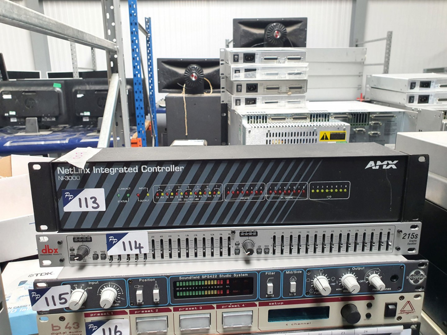 Fostex 80 reel to reel recorder – reproducer. Infortrend hard drive storage unit. Sony DMU-3024 digital meter unit. BTS BCB75, Sony DVR-28P, VO-5800PS, DVW-A500P, DVW-A510, DSR-1500, BVU-870P video cassette recorders / players. Sony DMR-2000 & Sony DMR-4000 digital master recorder. Marantz RC640CDR compact disc remote. 2x Audio Design DMM digital mini mixing consoles. Klark Teknik 3rd dimension BBD-320 analog multi-dimensional signal processor. Tektronix 118-AS audio synchroniser. Tektronix VS211A PAL video synchroniser. Tektronix 1741A waveform / vector monitor, TSL monitoring unit. Adams Smith Hudson 2600 System. 2x Tektronix 1721 vector scopes. Tektronix 143 Secam test signal generator. Qty Sony, Panasonic CRT monitors. 2x Sony PCM-1600 PCM audio unit. CPE Medisafe sonic irrigator. Sony BVR-20 remote control box. Korg Triton-Rack expandable HI module sampler. Blip MA2 control with remote. Sony PCM-7040, PCM-2500A, PCM 2500B, PCM-R500 digital audio recorder. Kramer VM-5AR11 video audio distribution amp. Tascam DX-4D professional noise reduction unit. 3x Sony MDS-B5 MD recorder. Electronic projector screen. Amonstar YJ-1500QZ stage fog machine. Sony SDP-1000 digital audio effector. JVC SA-T41E time base corrector. Sony DFX-2400 sampling rate converter. Nakamichi NR-200 noise reduction system. Sony DMR-2000 digital master recorder. 3x Sony PCM-9000 master disc recorder. 2x Revox G36 stereo reel to reel tape machine. Sanyo G-2615H-2 solid state stereo music centre. 2x Auso ELA75-77 PPM. Sony PS-T1 direct drive stereo turntable. Sanyo VTC-9300PN Betacord video cassette recorder. Qty transit cases. Nakamichi 1000 tri-tracer 3 head cassette system. Manitron monitor. 2x Sony DMX-R100 digital audio mixing console. Revox A700 reel to reel tape recorder. Qty various rack type shelves etc. AMX NI-3000 Netlink integrated controller. DBX 215S graphic equaliser. Soundfield SPS422 studio meter system. Junger B43 digital audio toolbox