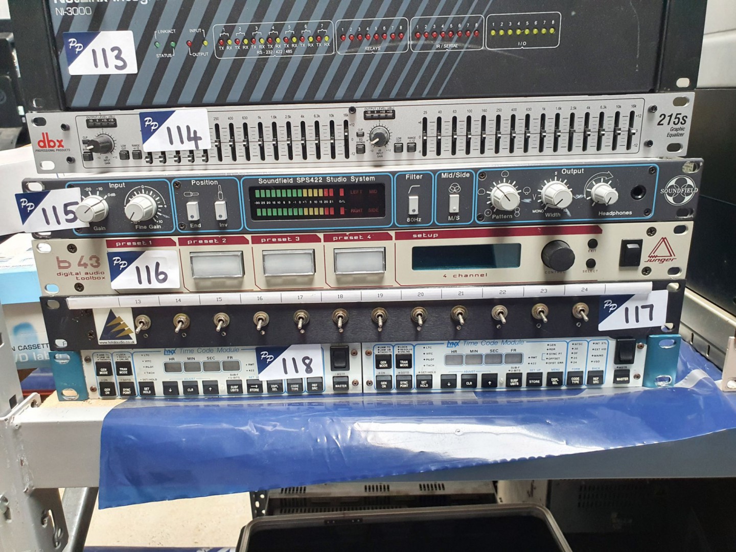 Fostex 80 reel to reel recorder – reproducer. Infortrend hard drive storage unit. Sony DMU-3024 digital meter unit. BTS BCB75, Sony DVR-28P, VO-5800PS, DVW-A500P, DVW-A510, DSR-1500, BVU-870P video cassette recorders / players. Sony DMR-2000 & Sony DMR-4000 digital master recorder. Marantz RC640CDR compact disc remote. 2x Audio Design DMM digital mini mixing consoles. Klark Teknik 3rd dimension BBD-320 analog multi-dimensional signal processor. Tektronix 118-AS audio synchroniser. Tektronix VS211A PAL video synchroniser. Tektronix 1741A waveform / vector monitor, TSL monitoring unit. Adams Smith Hudson 2600 System. 2x Tektronix 1721 vector scopes. Tektronix 143 Secam test signal generator. Qty Sony, Panasonic CRT monitors. 2x Sony PCM-1600 PCM audio unit. CPE Medisafe sonic irrigator. Sony BVR-20 remote control box. Korg Triton-Rack expandable HI module sampler. Blip MA2 control with remote. Sony PCM-7040, PCM-2500A, PCM 2500B, PCM-R500 digital audio recorder. Kramer VM-5AR11 video audio distribution amp. Tascam DX-4D professional noise reduction unit. 3x Sony MDS-B5 MD recorder. Electronic projector screen. Amonstar YJ-1500QZ stage fog machine. Sony SDP-1000 digital audio effector. JVC SA-T41E time base corrector. Sony DFX-2400 sampling rate converter. Nakamichi NR-200 noise reduction system. Sony DMR-2000 digital master recorder. 3x Sony PCM-9000 master disc recorder. 2x Revox G36 stereo reel to reel tape machine. Sanyo G-2615H-2 solid state stereo music centre. 2x Auso ELA75-77 PPM. Sony PS-T1 direct drive stereo turntable. Sanyo VTC-9300PN Betacord video cassette recorder. Qty transit cases. Nakamichi 1000 tri-tracer 3 head cassette system. Manitron monitor. 2x Sony DMX-R100 digital audio mixing console. Revox A700 reel to reel tape recorder. Qty various rack type shelves etc. AMX NI-3000 Netlink integrated controller. DBX 215S graphic equaliser. Soundfield SPS422 studio meter system. Junger B43 digital audio toolbox