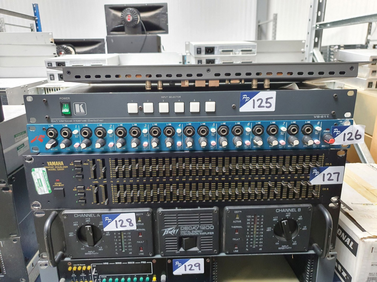 Rack type PPM. Otari UFC-24 universal format converter. Soundcraftsman TG2245 twin graphic balance in / out. Audio Design DBL-9 digital broadcast limiter. Black Magic Design smart view duo. Kramer VS-611 6x1 vertical interval switcher. SM Pro Audio D18 line mixer. Yamaha Q2031 graphic equaliser. Peavey Deca / 1200 digital energy conversion amp. Marantz RC640CDR remote control. Elite Camix 401 loudspeakers. Sony SL-C6UB Betamax video cassette recorder. Marantz DD-82 cassette deck. Sony PCM-701ES digital audio processor. 2x Marantz PMD321 CD player. Marantz CDR640 CD recorder. CD Associates SL25 CD-R analyser. Microphone sound deflector. Thump 12A powered loudspeakers. Mackie Active SWA1501 subwoofers. Ferrograph 4A, Teac A-3440 & Otari MX-5050, Otari MX7800, Otari MTR-10 reel to reel recorder. Sony LVA-8000P laser video disc player. 3x Sony Editing system. Chase etc microphone stands. Orla Shure Prestige electric organ on stand. Sony PCM-3324A digital audio recorder. Sony RM-3348 digital audio recorder remote. 2x DTS-6D playback system 12x Doremi Cinema AUD-D2A D/A audio converter. 9x Dolby CP500 digital cinema processor, Dolby DA20 digital film sound processor. Dolby SA10 surround adapter. 2x Master Image stereoscopic 3D theatre system. 2x loudspeaker subwoofers. Qty US, HP, Dell etc LCD monitors.