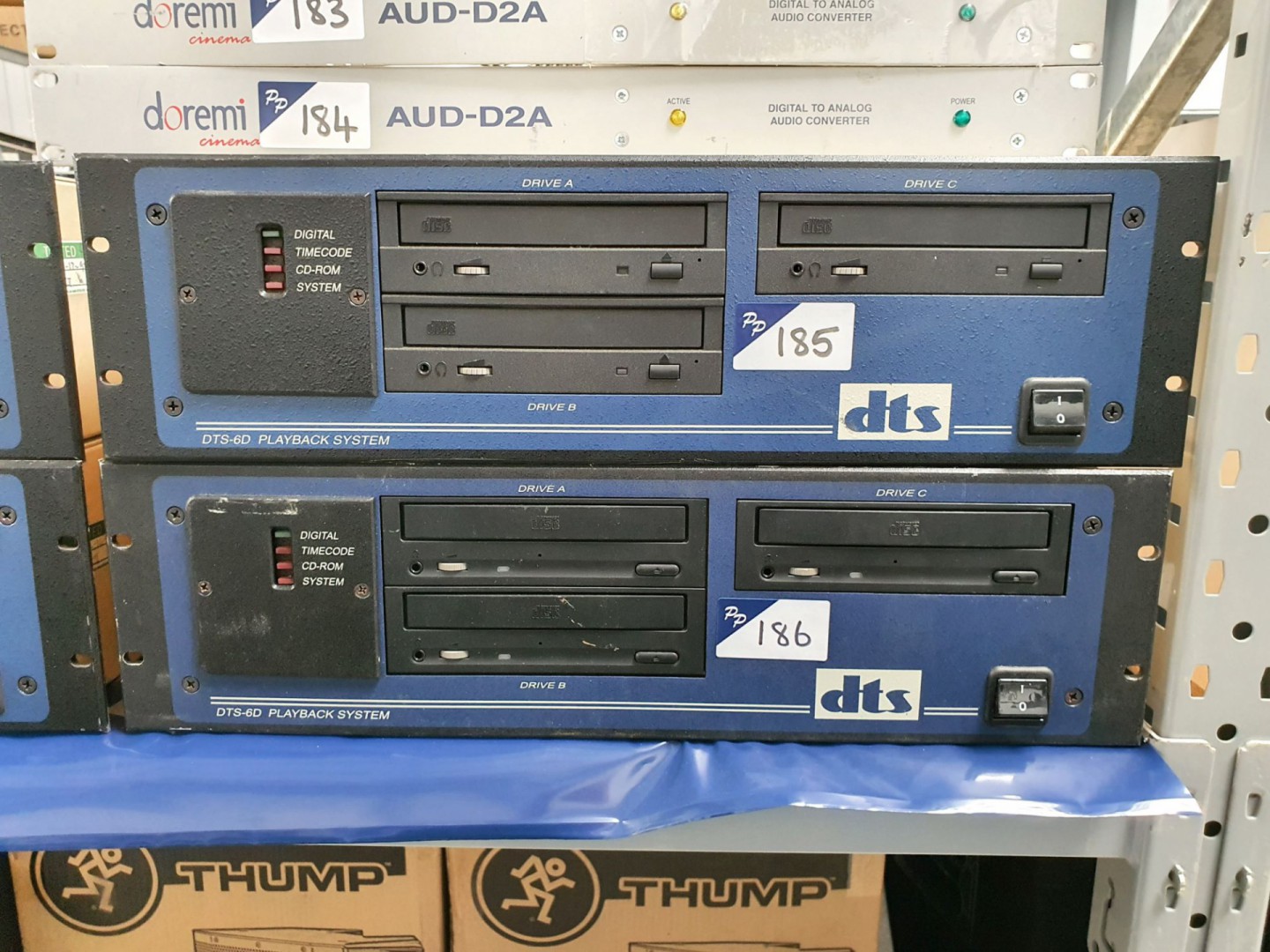 Rack type PPM. Otari UFC-24 universal format converter. Soundcraftsman TG2245 twin graphic balance in / out. Audio Design DBL-9 digital broadcast limiter. Black Magic Design smart view duo. Kramer VS-611 6x1 vertical interval switcher. SM Pro Audio D18 line mixer. Yamaha Q2031 graphic equaliser. Peavey Deca / 1200 digital energy conversion amp. Marantz RC640CDR remote control. Elite Camix 401 loudspeakers. Sony SL-C6UB Betamax video cassette recorder. Marantz DD-82 cassette deck. Sony PCM-701ES digital audio processor. 2x Marantz PMD321 CD player. Marantz CDR640 CD recorder. CD Associates SL25 CD-R analyser. Microphone sound deflector. Thump 12A powered loudspeakers. Mackie Active SWA1501 subwoofers. Ferrograph 4A, Teac A-3440 & Otari MX-5050, Otari MX7800, Otari MTR-10 reel to reel recorder. Sony LVA-8000P laser video disc player. 3x Sony Editing system. Chase etc microphone stands. Orla Shure Prestige electric organ on stand. Sony PCM-3324A digital audio recorder. Sony RM-3348 digital audio recorder remote. 2x DTS-6D playback system 12x Doremi Cinema AUD-D2A D/A audio converter. 9x Dolby CP500 digital cinema processor, Dolby DA20 digital film sound processor. Dolby SA10 surround adapter. 2x Master Image stereoscopic 3D theatre system. 2x loudspeaker subwoofers. Qty US, HP, Dell etc LCD monitors.