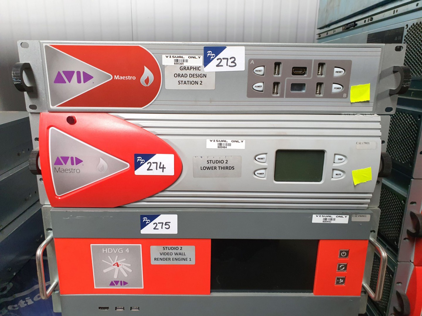 8x Humax HB-1000S Freesat HD boxes. 10x CTP Systems DMD400 edit monitor unit. 4x Aten CS1942DP USB 3.0 display port dual display KVMP switch. Industrial Computers ACP-4000 media server, 2x HP Proliant DL360P Gen 8 server frames. Harris RCP-32 LCD control panel, PSU. Sony XDS-PD1000 professional media station. Sony HDW-M2000P HD digital video cassette recorder. 2x Pulsar 6RMX3 Chroma Zone lighting controller. 3x NovaStar MCTRL660 LED display controller. Harris Imagine MCS-CLIP24-H OCP RGB shotbox / automation controller. 2x Brown DPA 4066 stage microphone. Riedel RCP-2016 P4 16-key LED desktop control intercom panel. 2x Riedel CPU-128S G2 input card. Lindy KVM switch pro audio. 3x Miranda X-3D media server. 2x Avid Maestro HDVG 2LL graphics platform. Qty Avid HDVG+ Proset graphics platform. DViT 8084i Smart Board 84" interactive touch display. APC SUA5000RM15U Smart UPS. Qty freestanding mobile L55HD6 LCD digital poster screens. Qty various server cabinets. DJi Matrice 210 drone. DJi Zenmuse XT ZXT01 drone camera lens. 5x DJi PH4-5870 Phantom 4 intelligent flight battery. Core EL CT-SB-EA-01-04 stagebox. Miranda Tango. 3x Quantel SDi DA. Pro-Bel 6712 matrix panel. Pro-Bel 6276/6277 rack type router