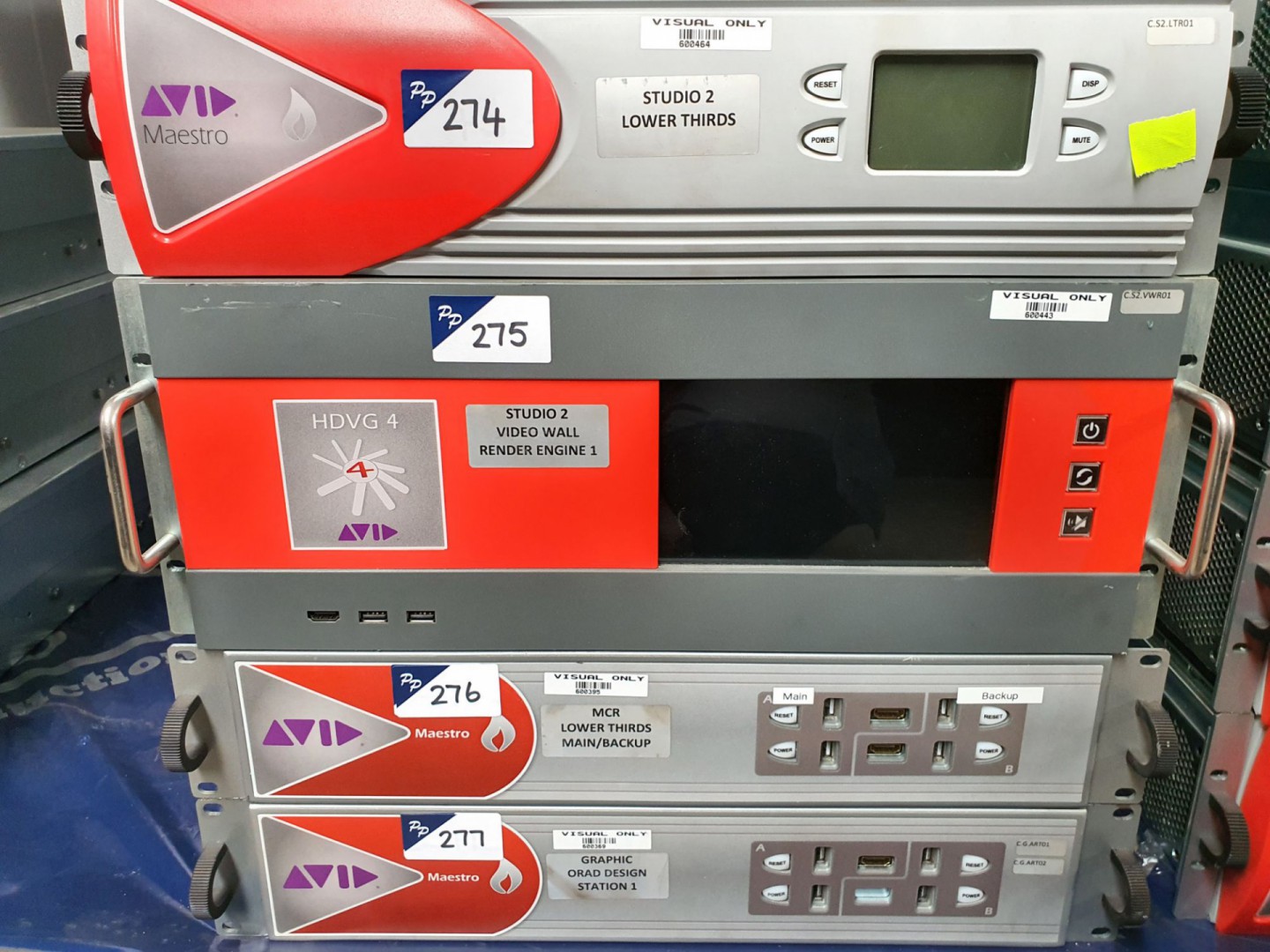 8x Humax HB-1000S Freesat HD boxes. 10x CTP Systems DMD400 edit monitor unit. 4x Aten CS1942DP USB 3.0 display port dual display KVMP switch. Industrial Computers ACP-4000 media server, 2x HP Proliant DL360P Gen 8 server frames. Harris RCP-32 LCD control panel, PSU. Sony XDS-PD1000 professional media station. Sony HDW-M2000P HD digital video cassette recorder. 2x Pulsar 6RMX3 Chroma Zone lighting controller. 3x NovaStar MCTRL660 LED display controller. Harris Imagine MCS-CLIP24-H OCP RGB shotbox / automation controller. 2x Brown DPA 4066 stage microphone. Riedel RCP-2016 P4 16-key LED desktop control intercom panel. 2x Riedel CPU-128S G2 input card. Lindy KVM switch pro audio. 3x Miranda X-3D media server. 2x Avid Maestro HDVG 2LL graphics platform. Qty Avid HDVG+ Proset graphics platform. DViT 8084i Smart Board 84" interactive touch display. APC SUA5000RM15U Smart UPS. Qty freestanding mobile L55HD6 LCD digital poster screens. Qty various server cabinets. DJi Matrice 210 drone. DJi Zenmuse XT ZXT01 drone camera lens. 5x DJi PH4-5870 Phantom 4 intelligent flight battery. Core EL CT-SB-EA-01-04 stagebox. Miranda Tango. 3x Quantel SDi DA. Pro-Bel 6712 matrix panel. Pro-Bel 6276/6277 rack type router
