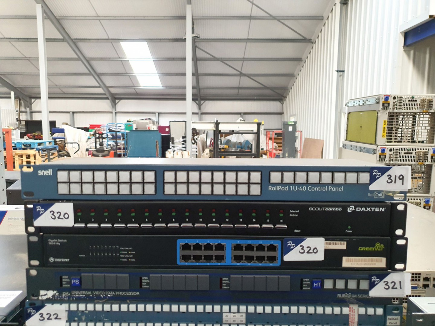 Snell router panel. Snell Roll Pod IU-40 control panel. Trendnet Greennet TEG-S16G gigabit switch, Daxten Scout Combo 16 channel router. Rubidium Seriest universal video data processor. Snell Roll Call matrix panels.