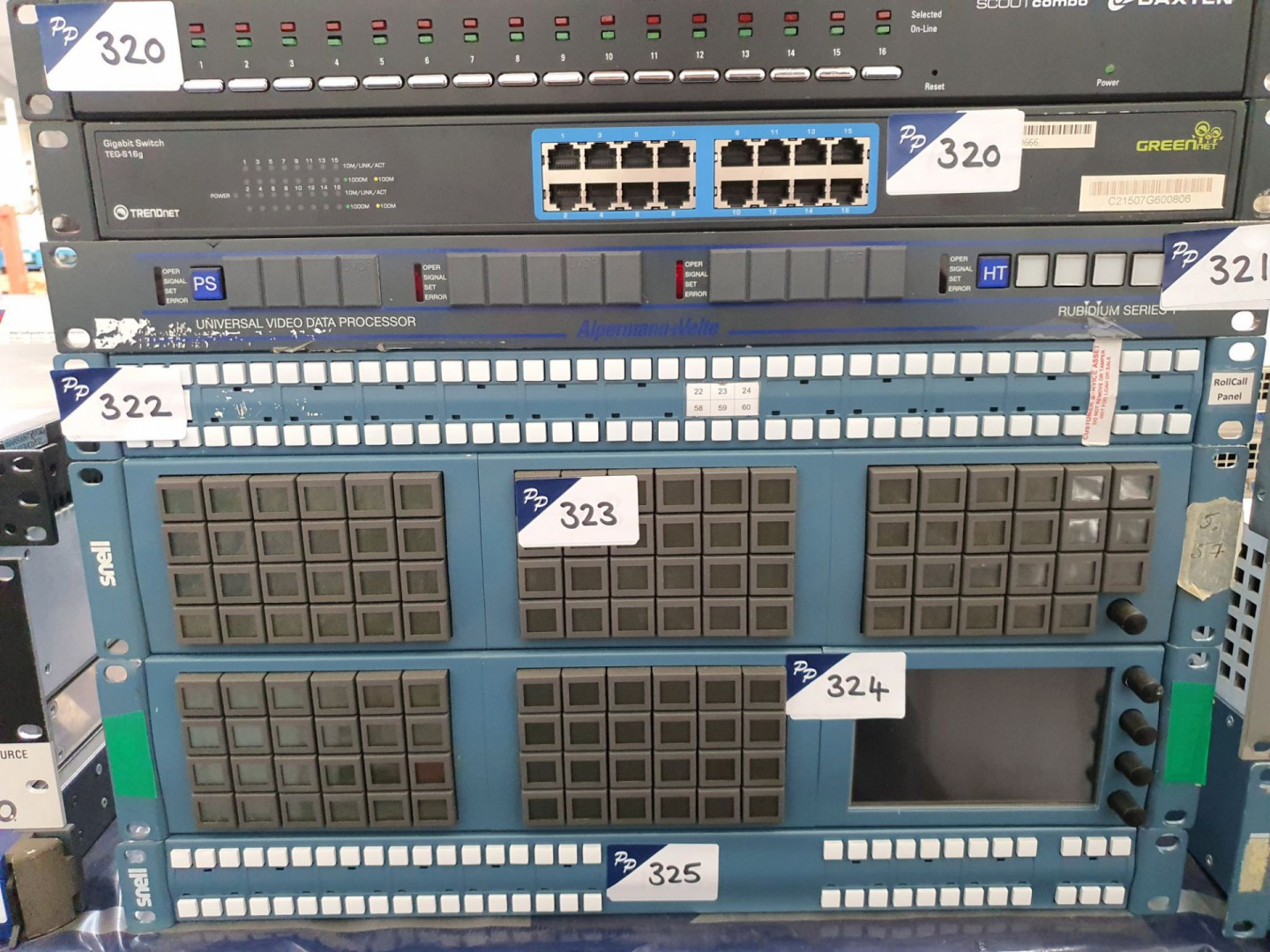 Snell router panel. Snell Roll Pod IU-40 control panel. Trendnet Greennet TEG-S16G gigabit switch, Daxten Scout Combo 16 channel router. Rubidium Seriest universal video data processor. Snell Roll Call matrix panels.