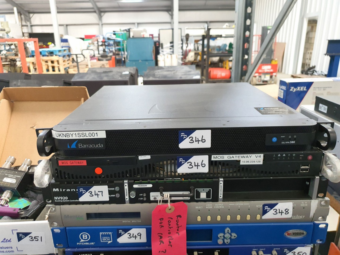 Barracuda SSL VPN 380 firewall gateway. Niche HD-SDi RMU. Quantel HD source. Snell HST37 HD test pattern generator. Grass Valley K-Frame video production centre. Grass Valley Sirius 830 frame. Cobalt OGCP-9000/CC remote control panel. Quantel SQ SAS adaptor, MOS gateway, Barracuda SSL VPN 380. Miranda NV920 routing system controller. Trilogy mento digital SPG/TSG. Vigor pitch blue magubox. Snell HST37 HD test pattern generator. Miranda ASD-271P Picolink, HP 35676-66302 signal divider. Qty various Miranda spares. 4x Miranda ABT-32-32-D110 audio bridge terminal. Grass Valley 85552910 control panel. 4x Sam 9678570 1U matrix panel. 3x Grass Valley FGAEK 9678570 AA 1U matrix panel. Grass Valley LD16 Jupiter control panel. Pro-Bel Aurora processor panel. Alpermann & Velte timer control unit. Axon CP1616 matrix panel