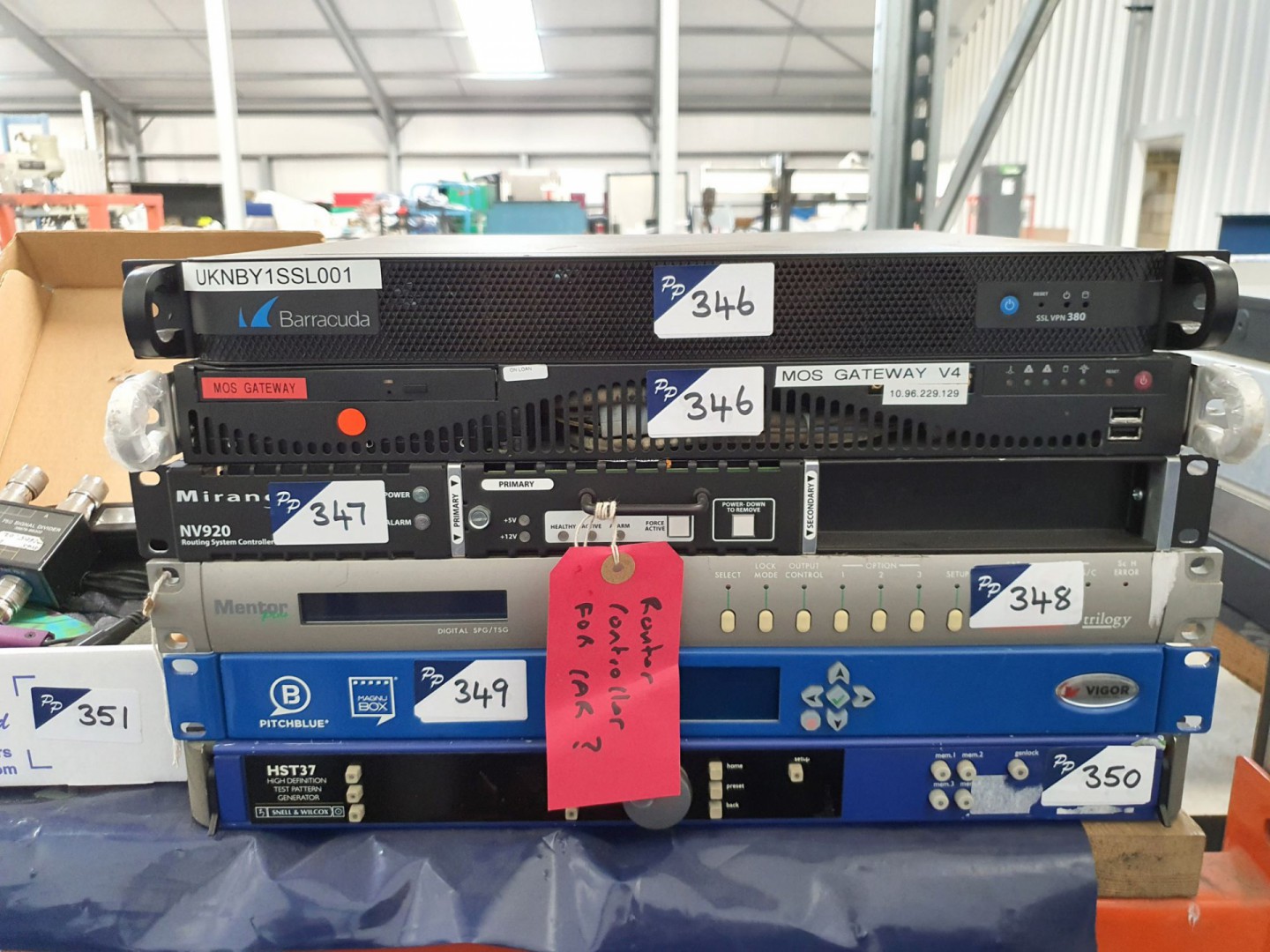 Barracuda SSL VPN 380 firewall gateway. Niche HD-SDi RMU. Quantel HD source. Snell HST37 HD test pattern generator. Grass Valley K-Frame video production centre. Grass Valley Sirius 830 frame. Cobalt OGCP-9000/CC remote control panel. Quantel SQ SAS adaptor, MOS gateway, Barracuda SSL VPN 380. Miranda NV920 routing system controller. Trilogy mento digital SPG/TSG. Vigor pitch blue magubox. Snell HST37 HD test pattern generator. Miranda ASD-271P Picolink, HP 35676-66302 signal divider. Qty various Miranda spares. 4x Miranda ABT-32-32-D110 audio bridge terminal. Grass Valley 85552910 control panel. 4x Sam 9678570 1U matrix panel. 3x Grass Valley FGAEK 9678570 AA 1U matrix panel. Grass Valley LD16 Jupiter control panel. Pro-Bel Aurora processor panel. Alpermann & Velte timer control unit. Axon CP1616 matrix panel