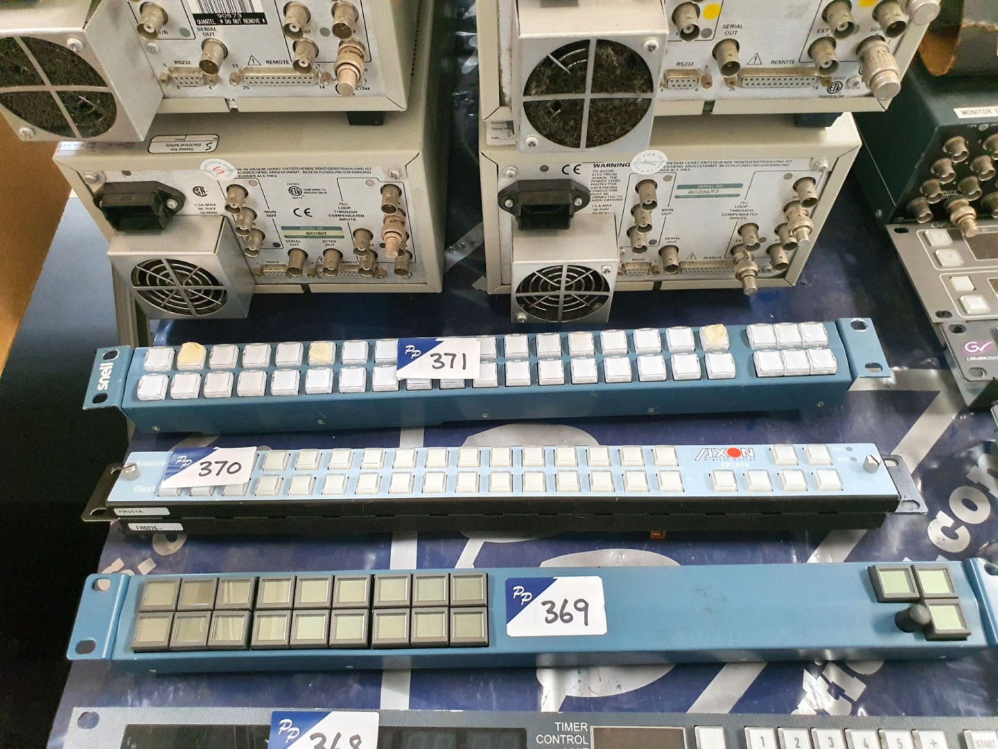 2x Snell Roll Call matrix panels. Qty various Farnell 463-048 connectors / sockets. Qlogic Sanbox 5800 fibre switch. Sam Kula 1ME control panel. 3x Miranda CR3232-AV analog video router. Qty various Snell IQ modular frame. Finisar XGIG fibre channel analyser. Grass Valley XY encore / prelude universal control panel. Grass Valley BPS Encore button-per-source control panel. DVS Atomix Bob 4x SDi panels. Snell Kahuna remote aux panel. 3x Kramer 621T DVI optical transmitters. Grass Valley Kahuna LCD panel console. 4x Stonesoft APP-FW-105-C1 stonegate modular firewall appliance. 3x Stereo Brain SB1+ 3D processor. 3x Cisco Aironet 802 dual band access point. Snell Roll Pod 3U-12 control panel & PSU. 2x Grass Valley Kaleido-RCP2 multiviewer remote control panel. Snell Kahuna 360 Compact console. Miranda RCP-BR touchscreen branding control.
