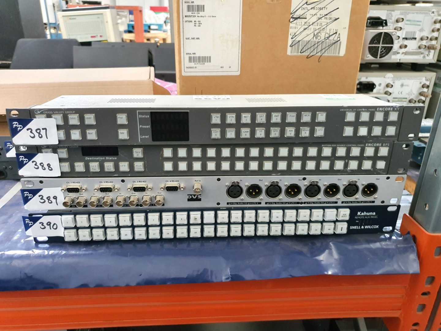 2x Snell Roll Call matrix panels. Qty various Farnell 463-048 connectors / sockets. Qlogic Sanbox 5800 fibre switch. Sam Kula 1ME control panel. 3x Miranda CR3232-AV analog video router. Qty various Snell IQ modular frame. Finisar XGIG fibre channel analyser. Grass Valley XY encore / prelude universal control panel. Grass Valley BPS Encore button-per-source control panel. DVS Atomix Bob 4x SDi panels. Snell Kahuna remote aux panel. 3x Kramer 621T DVI optical transmitters. Grass Valley Kahuna LCD panel console. 4x Stonesoft APP-FW-105-C1 stonegate modular firewall appliance. 3x Stereo Brain SB1+ 3D processor. 3x Cisco Aironet 802 dual band access point. Snell Roll Pod 3U-12 control panel & PSU. 2x Grass Valley Kaleido-RCP2 multiviewer remote control panel. Snell Kahuna 360 Compact console. Miranda RCP-BR touchscreen branding control.