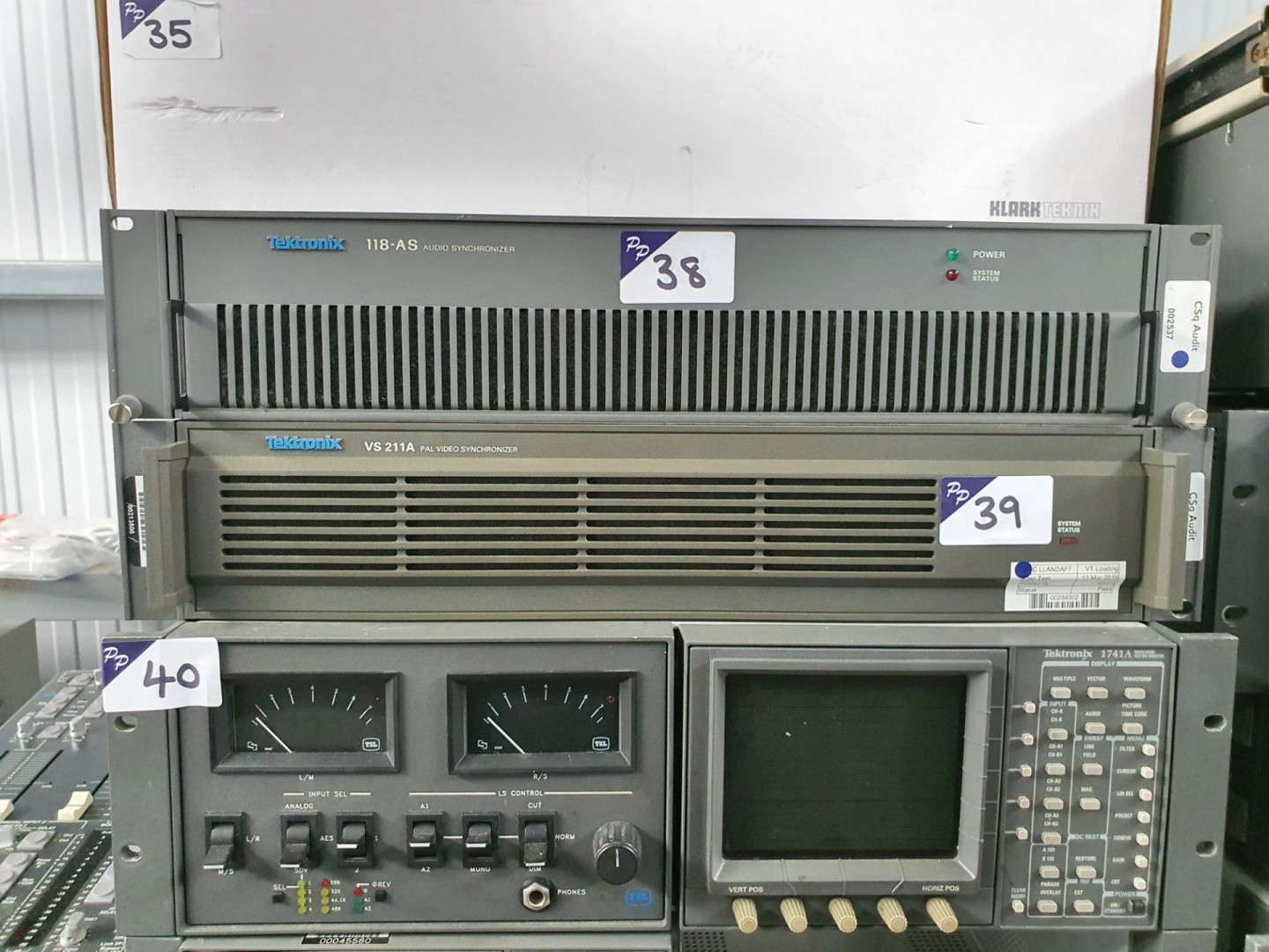 Fostex 80 reel to reel recorder – reproducer. Infortrend hard drive storage unit. Sony DMU-3024 digital meter unit. BTS BCB75, Sony DVR-28P, VO-5800PS, DVW-A500P, DVW-A510, DSR-1500, BVU-870P video cassette recorders / players. Sony DMR-2000 & Sony DMR-4000 digital master recorder. Marantz RC640CDR compact disc remote. 2x Audio Design DMM digital mini mixing consoles. Klark Teknik 3rd dimension BBD-320 analog multi-dimensional signal processor. Tektronix 118-AS audio synchroniser. Tektronix VS211A PAL video synchroniser. Tektronix 1741A waveform / vector monitor, TSL monitoring unit. Adams Smith Hudson 2600 System. 2x Tektronix 1721 vector scopes. Tektronix 143 Secam test signal generator. Qty Sony, Panasonic CRT monitors. 2x Sony PCM-1600 PCM audio unit. CPE Medisafe sonic irrigator. Sony BVR-20 remote control box. Korg Triton-Rack expandable HI module sampler. Blip MA2 control with remote. Sony PCM-7040, PCM-2500A, PCM 2500B, PCM-R500 digital audio recorder. Kramer VM-5AR11 video audio distribution amp. Tascam DX-4D professional noise reduction unit. 3x Sony MDS-B5 MD recorder. Electronic projector screen. Amonstar YJ-1500QZ stage fog machine. Sony SDP-1000 digital audio effector. JVC SA-T41E time base corrector. Sony DFX-2400 sampling rate converter. Nakamichi NR-200 noise reduction system. Sony DMR-2000 digital master recorder. 3x Sony PCM-9000 master disc recorder. 2x Revox G36 stereo reel to reel tape machine. Sanyo G-2615H-2 solid state stereo music centre. 2x Auso ELA75-77 PPM. Sony PS-T1 direct drive stereo turntable. Sanyo VTC-9300PN Betacord video cassette recorder. Qty transit cases. Nakamichi 1000 tri-tracer 3 head cassette system. Manitron monitor. 2x Sony DMX-R100 digital audio mixing console. Revox A700 reel to reel tape recorder. Qty various rack type shelves etc. AMX NI-3000 Netlink integrated controller. DBX 215S graphic equaliser. Soundfield SPS422 studio meter system. Junger B43 digital audio toolbox