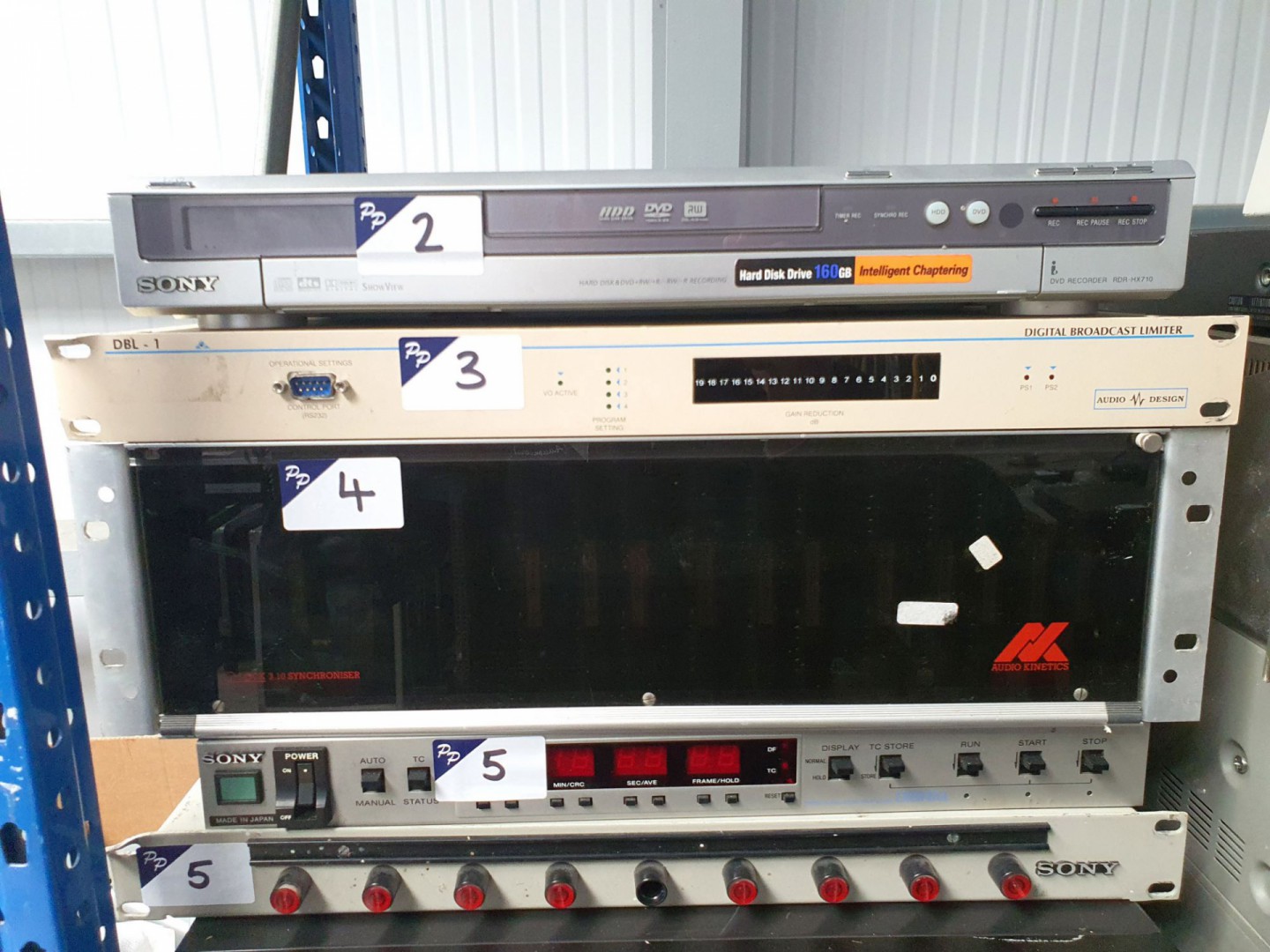 Rack type PPM. Otari UFC-24 universal format converter. Soundcraftsman TG2245 twin graphic balance in / out. Audio Design DBL-9 digital broadcast limiter. Black Magic Design smart view duo. Kramer VS-611 6x1 vertical interval switcher. SM Pro Audio D18 line mixer. Yamaha Q2031 graphic equaliser. Peavey Deca / 1200 digital energy conversion amp. Marantz RC640CDR remote control. Elite Camix 401 loudspeakers. Sony SL-C6UB Betamax video cassette recorder. Marantz DD-82 cassette deck. Sony PCM-701ES digital audio processor. 2x Marantz PMD321 CD player. Marantz CDR640 CD recorder. CD Associates SL25 CD-R analyser. Microphone sound deflector. Thump 12A powered loudspeakers. Mackie Active SWA1501 subwoofers. Ferrograph 4A, Teac A-3440 & Otari MX-5050, Otari MX7800, Otari MTR-10 reel to reel recorder. Sony LVA-8000P laser video disc player. 3x Sony Editing system. Chase etc microphone stands. Orla Shure Prestige electric organ on stand. Sony PCM-3324A digital audio recorder. Sony RM-3348 digital audio recorder remote. 2x DTS-6D playback system 12x Doremi Cinema AUD-D2A D/A audio converter. 9x Dolby CP500 digital cinema processor, Dolby DA20 digital film sound processor. Dolby SA10 surround adapter. 2x Master Image stereoscopic 3D theatre system. 2x loudspeaker subwoofers. Qty US, HP, Dell etc LCD monitors.