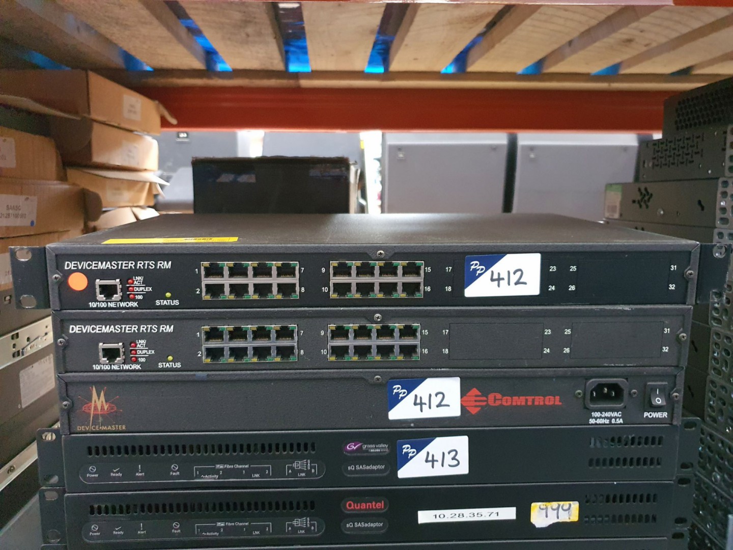 Wacom Intuos 3 graphics tablet. Qty HP Procurve, Cisco, Netgear etc network switches. 3x Comtrol Device Master RTS RM. 6x Grass Valley / 2x Quantel SQ SAS adaptors. 10x Neutrik NAC3FC-HC power on power cables. Chromatec card modules. 15x Snell RMPFP VegatJ2Y Vega 1/0 test jigs. Qty various fibre & Kontron modules. Qty BVM SCSi I/F cards. 4x Grass Valley S3 front interconnect modules. 4x DeltaCast capture cards.