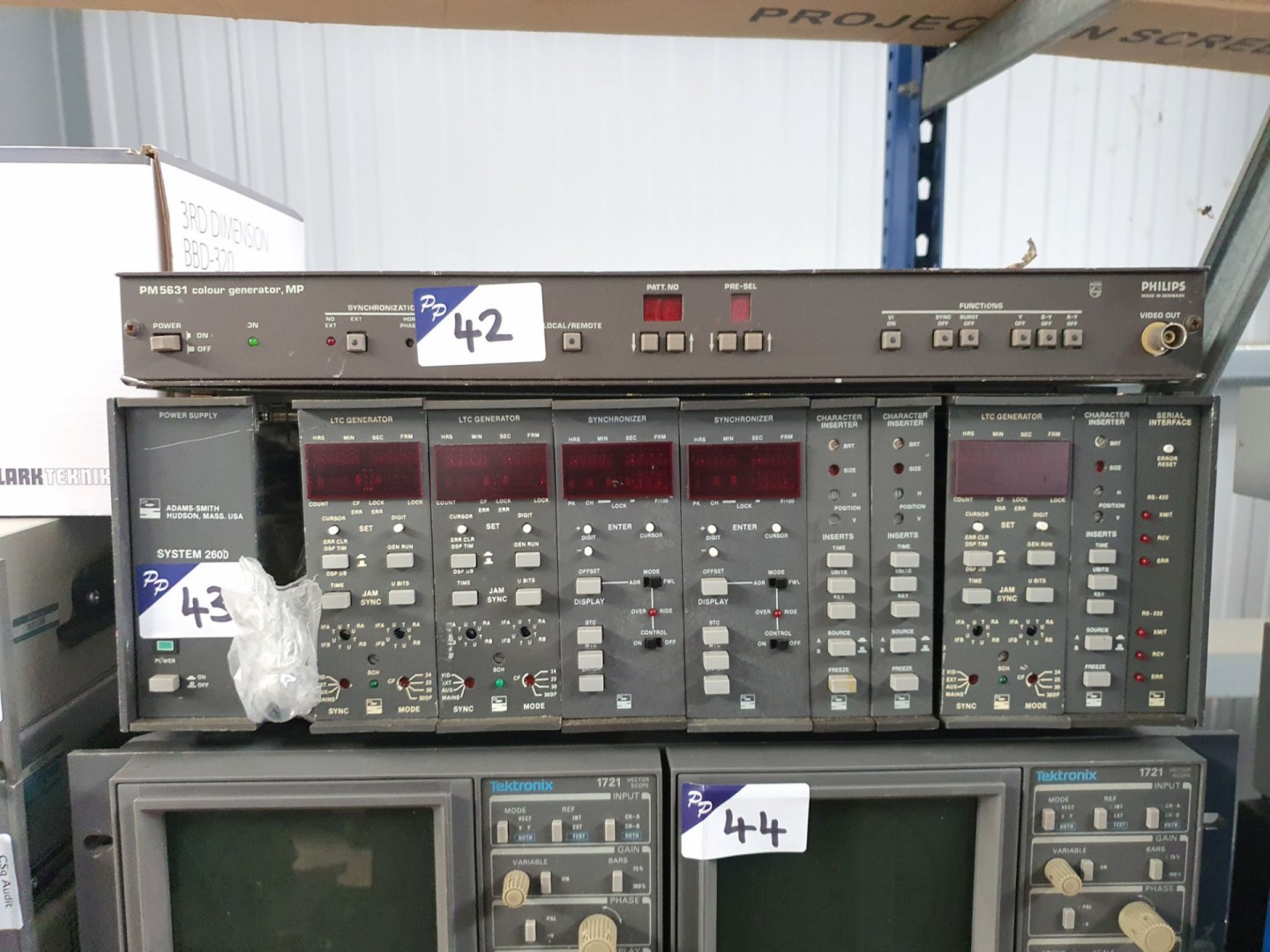 Fostex 80 reel to reel recorder – reproducer. Infortrend hard drive storage unit. Sony DMU-3024 digital meter unit. BTS BCB75, Sony DVR-28P, VO-5800PS, DVW-A500P, DVW-A510, DSR-1500, BVU-870P video cassette recorders / players. Sony DMR-2000 & Sony DMR-4000 digital master recorder. Marantz RC640CDR compact disc remote. 2x Audio Design DMM digital mini mixing consoles. Klark Teknik 3rd dimension BBD-320 analog multi-dimensional signal processor. Tektronix 118-AS audio synchroniser. Tektronix VS211A PAL video synchroniser. Tektronix 1741A waveform / vector monitor, TSL monitoring unit. Adams Smith Hudson 2600 System. 2x Tektronix 1721 vector scopes. Tektronix 143 Secam test signal generator. Qty Sony, Panasonic CRT monitors. 2x Sony PCM-1600 PCM audio unit. CPE Medisafe sonic irrigator. Sony BVR-20 remote control box. Korg Triton-Rack expandable HI module sampler. Blip MA2 control with remote. Sony PCM-7040, PCM-2500A, PCM 2500B, PCM-R500 digital audio recorder. Kramer VM-5AR11 video audio distribution amp. Tascam DX-4D professional noise reduction unit. 3x Sony MDS-B5 MD recorder. Electronic projector screen. Amonstar YJ-1500QZ stage fog machine. Sony SDP-1000 digital audio effector. JVC SA-T41E time base corrector. Sony DFX-2400 sampling rate converter. Nakamichi NR-200 noise reduction system. Sony DMR-2000 digital master recorder. 3x Sony PCM-9000 master disc recorder. 2x Revox G36 stereo reel to reel tape machine. Sanyo G-2615H-2 solid state stereo music centre. 2x Auso ELA75-77 PPM. Sony PS-T1 direct drive stereo turntable. Sanyo VTC-9300PN Betacord video cassette recorder. Qty transit cases. Nakamichi 1000 tri-tracer 3 head cassette system. Manitron monitor. 2x Sony DMX-R100 digital audio mixing console. Revox A700 reel to reel tape recorder. Qty various rack type shelves etc. AMX NI-3000 Netlink integrated controller. DBX 215S graphic equaliser. Soundfield SPS422 studio meter system. Junger B43 digital audio toolbox