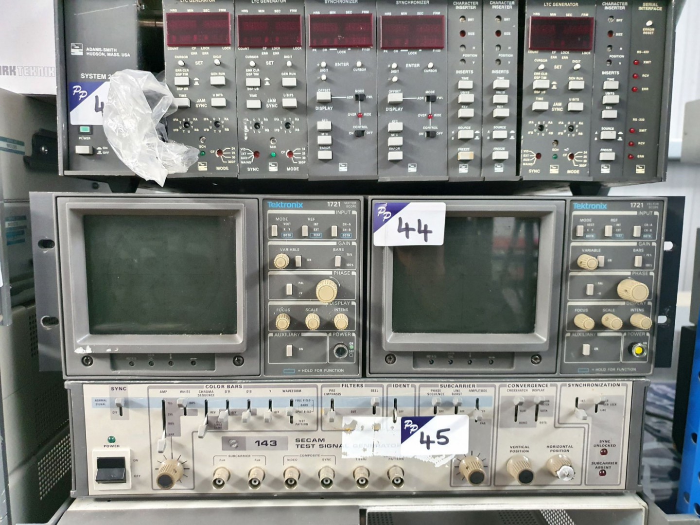 Fostex 80 reel to reel recorder – reproducer. Infortrend hard drive storage unit. Sony DMU-3024 digital meter unit. BTS BCB75, Sony DVR-28P, VO-5800PS, DVW-A500P, DVW-A510, DSR-1500, BVU-870P video cassette recorders / players. Sony DMR-2000 & Sony DMR-4000 digital master recorder. Marantz RC640CDR compact disc remote. 2x Audio Design DMM digital mini mixing consoles. Klark Teknik 3rd dimension BBD-320 analog multi-dimensional signal processor. Tektronix 118-AS audio synchroniser. Tektronix VS211A PAL video synchroniser. Tektronix 1741A waveform / vector monitor, TSL monitoring unit. Adams Smith Hudson 2600 System. 2x Tektronix 1721 vector scopes. Tektronix 143 Secam test signal generator. Qty Sony, Panasonic CRT monitors. 2x Sony PCM-1600 PCM audio unit. CPE Medisafe sonic irrigator. Sony BVR-20 remote control box. Korg Triton-Rack expandable HI module sampler. Blip MA2 control with remote. Sony PCM-7040, PCM-2500A, PCM 2500B, PCM-R500 digital audio recorder. Kramer VM-5AR11 video audio distribution amp. Tascam DX-4D professional noise reduction unit. 3x Sony MDS-B5 MD recorder. Electronic projector screen. Amonstar YJ-1500QZ stage fog machine. Sony SDP-1000 digital audio effector. JVC SA-T41E time base corrector. Sony DFX-2400 sampling rate converter. Nakamichi NR-200 noise reduction system. Sony DMR-2000 digital master recorder. 3x Sony PCM-9000 master disc recorder. 2x Revox G36 stereo reel to reel tape machine. Sanyo G-2615H-2 solid state stereo music centre. 2x Auso ELA75-77 PPM. Sony PS-T1 direct drive stereo turntable. Sanyo VTC-9300PN Betacord video cassette recorder. Qty transit cases. Nakamichi 1000 tri-tracer 3 head cassette system. Manitron monitor. 2x Sony DMX-R100 digital audio mixing console. Revox A700 reel to reel tape recorder. Qty various rack type shelves etc. AMX NI-3000 Netlink integrated controller. DBX 215S graphic equaliser. Soundfield SPS422 studio meter system. Junger B43 digital audio toolbox