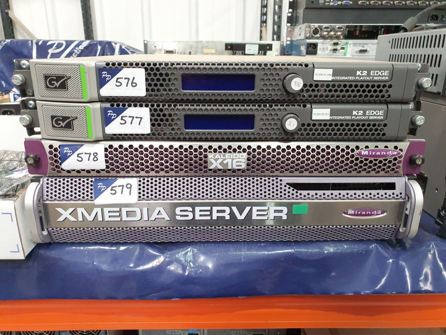 Grass Valley IQ modular frame. 4x Exinda 4010 network switch. Fibre Data fibre optic & optoelectronic kit. Snell & Wilcox IQ Modular Roll Call frame. Ensemble Avenue signal integration system frame. Grass Valley DMC 1000/10 infinity digital media camcorder. 7x Quantel HD servers. 2x Eminence EKMP78A 18" subs.