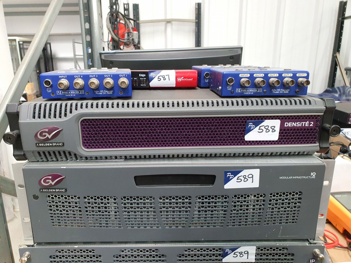 Barracuda SSL VPN 380 firewall gateway. Niche HD-SDi RMU. Quantel HD source. Snell HST37 HD test pattern generator. Grass Valley K-Frame video production centre. Grass Valley Sirius 830 frame. Cobalt OGCP-9000/CC remote control panel. Quantel SQ SAS adaptor, MOS gateway, Barracuda SSL VPN 380. Miranda NV920 routing system controller. Trilogy mento digital SPG/TSG. Vigor pitch blue magubox. Snell HST37 HD test pattern generator. Miranda ASD-271P Picolink, HP 35676-66302 signal divider. Qty various Miranda spares. 4x Miranda ABT-32-32-D110 audio bridge terminal. Grass Valley 85552910 control panel. 4x Sam 9678570 1U matrix panel. 3x Grass Valley FGAEK 9678570 AA 1U matrix panel. Grass Valley LD16 Jupiter control panel. Pro-Bel Aurora processor panel. Alpermann & Velte timer control unit. Axon CP1616 matrix panel