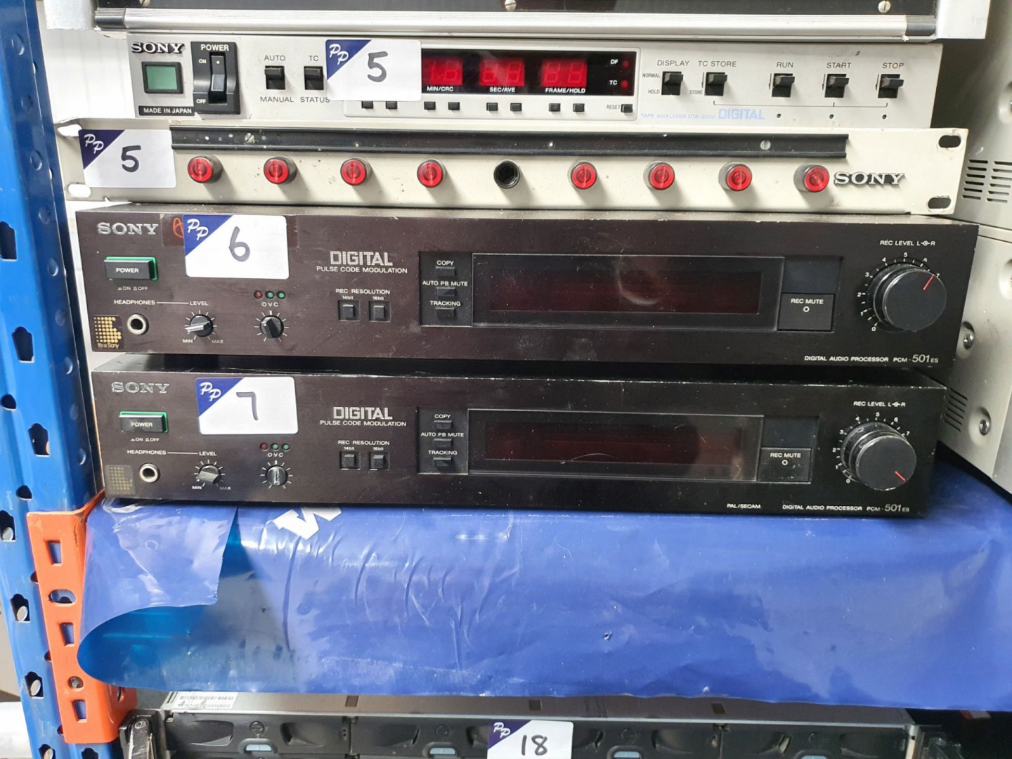 Rack type PPM. Otari UFC-24 universal format converter. Soundcraftsman TG2245 twin graphic balance in / out. Audio Design DBL-9 digital broadcast limiter. Black Magic Design smart view duo. Kramer VS-611 6x1 vertical interval switcher. SM Pro Audio D18 line mixer. Yamaha Q2031 graphic equaliser. Peavey Deca / 1200 digital energy conversion amp. Marantz RC640CDR remote control. Elite Camix 401 loudspeakers. Sony SL-C6UB Betamax video cassette recorder. Marantz DD-82 cassette deck. Sony PCM-701ES digital audio processor. 2x Marantz PMD321 CD player. Marantz CDR640 CD recorder. CD Associates SL25 CD-R analyser. Microphone sound deflector. Thump 12A powered loudspeakers. Mackie Active SWA1501 subwoofers. Ferrograph 4A, Teac A-3440 & Otari MX-5050, Otari MX7800, Otari MTR-10 reel to reel recorder. Sony LVA-8000P laser video disc player. 3x Sony Editing system. Chase etc microphone stands. Orla Shure Prestige electric organ on stand. Sony PCM-3324A digital audio recorder. Sony RM-3348 digital audio recorder remote. 2x DTS-6D playback system 12x Doremi Cinema AUD-D2A D/A audio converter. 9x Dolby CP500 digital cinema processor, Dolby DA20 digital film sound processor. Dolby SA10 surround adapter. 2x Master Image stereoscopic 3D theatre system. 2x loudspeaker subwoofers. Qty US, HP, Dell etc LCD monitors.