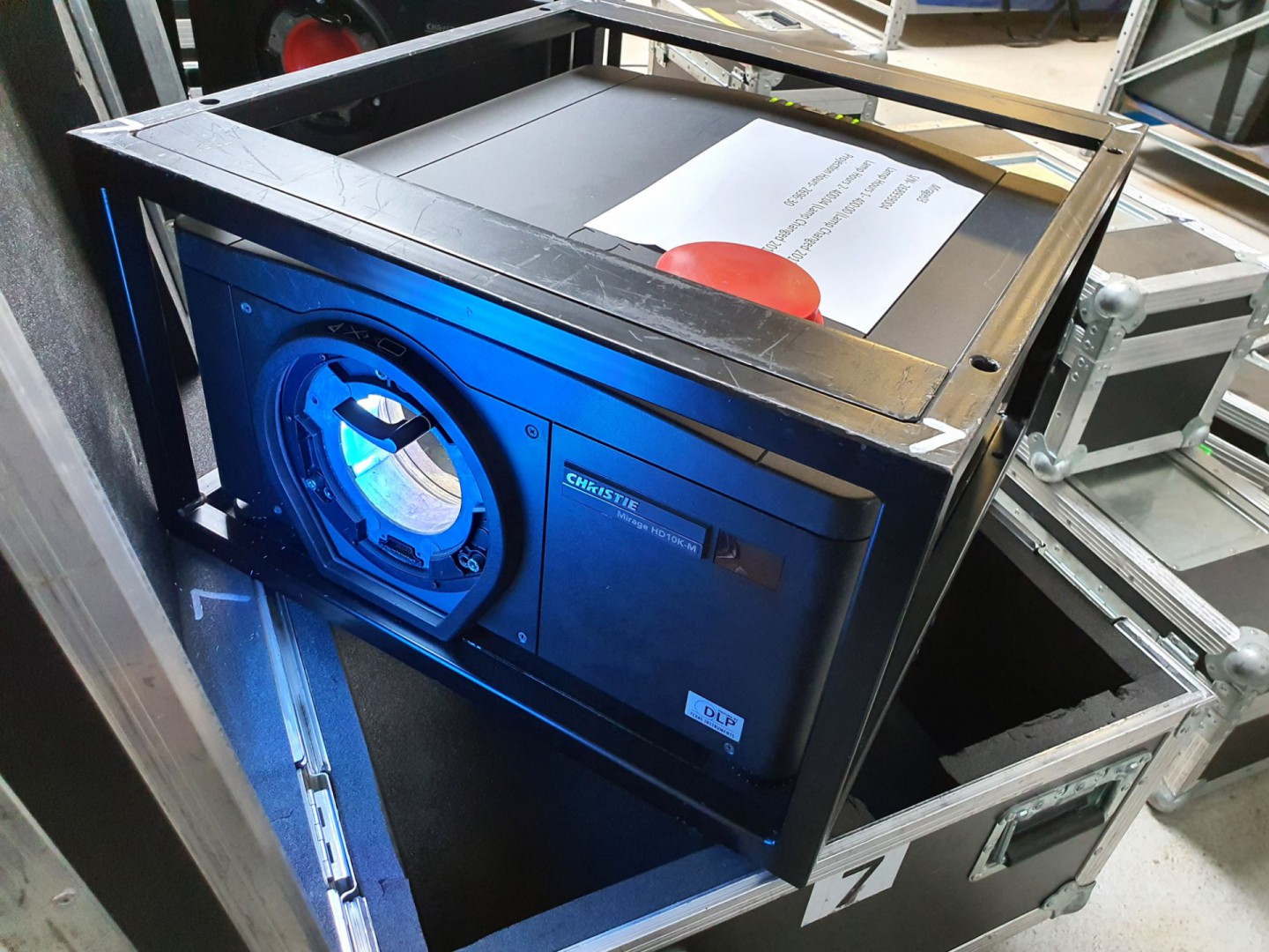 Christie Mirage HD10K-M projector with remote & hanging frame in mobile transit case, s/n 268939004 (03/11) & Christie ILS Lens, 2.8-4.5:1 SX+ / 2.6-4.1:1 HD, 0.95", 3 chip DLP in transit case
