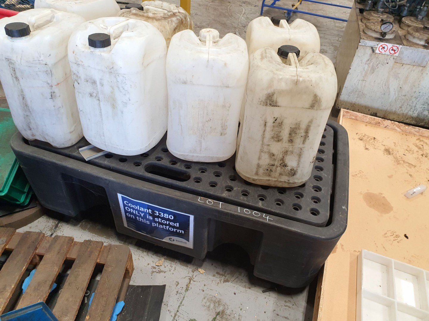 Dantherm extraction (2006). Qty various oil drip trays & stands, forkable metal waste bins