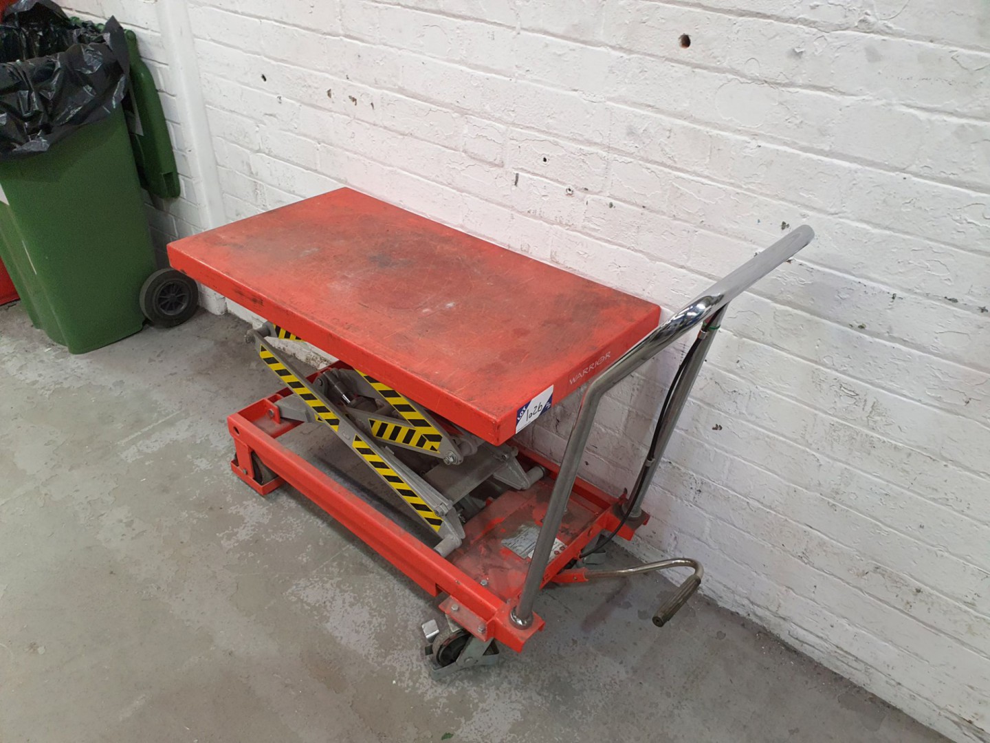 2x Midland Bearing TFD70 mobile lift table (2019). Pallet Truck Shop model SFH10W12 1000kg mobile pallet lifter (2008)