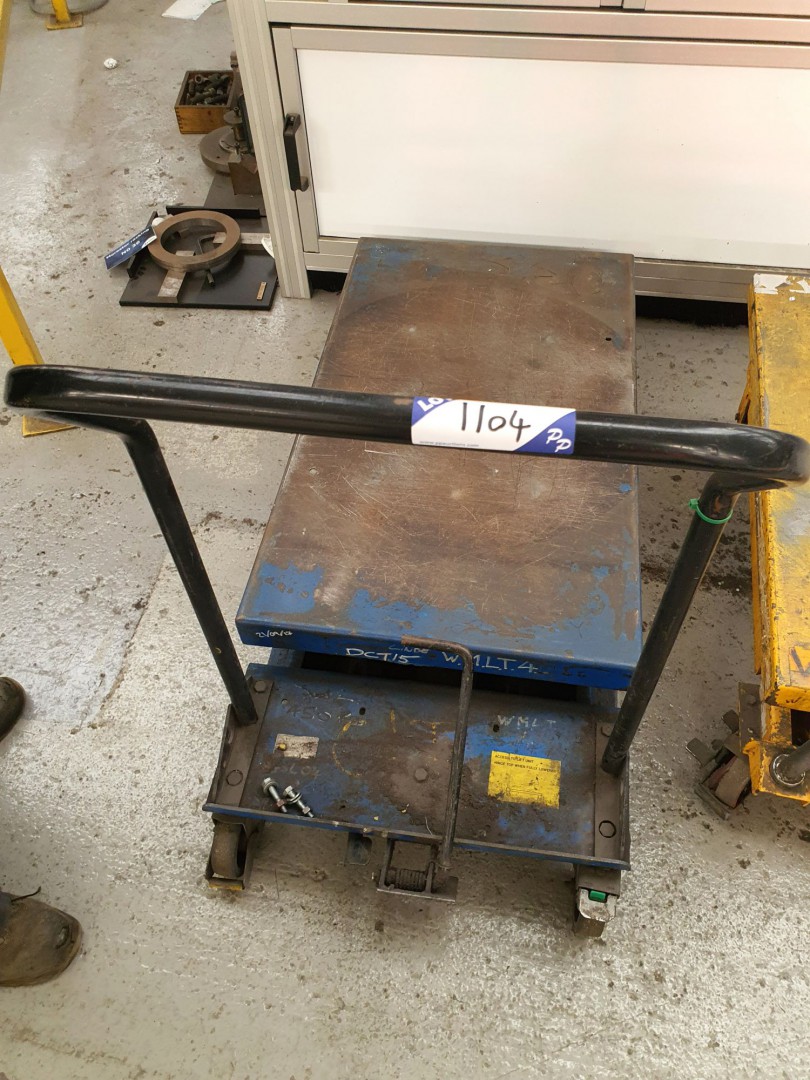 2x Midland Bearing TFD70 mobile lift table (2019). Pallet Truck Shop model SFH10W12 1000kg mobile pallet lifter (2008)