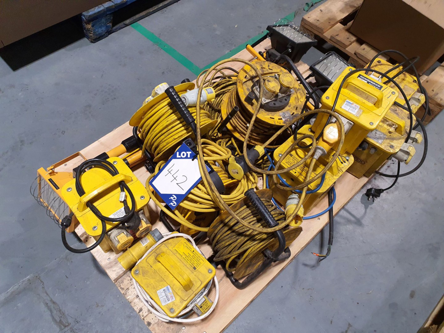 Qty various inc: 110v transformers, extension cable reels, work lights etc
