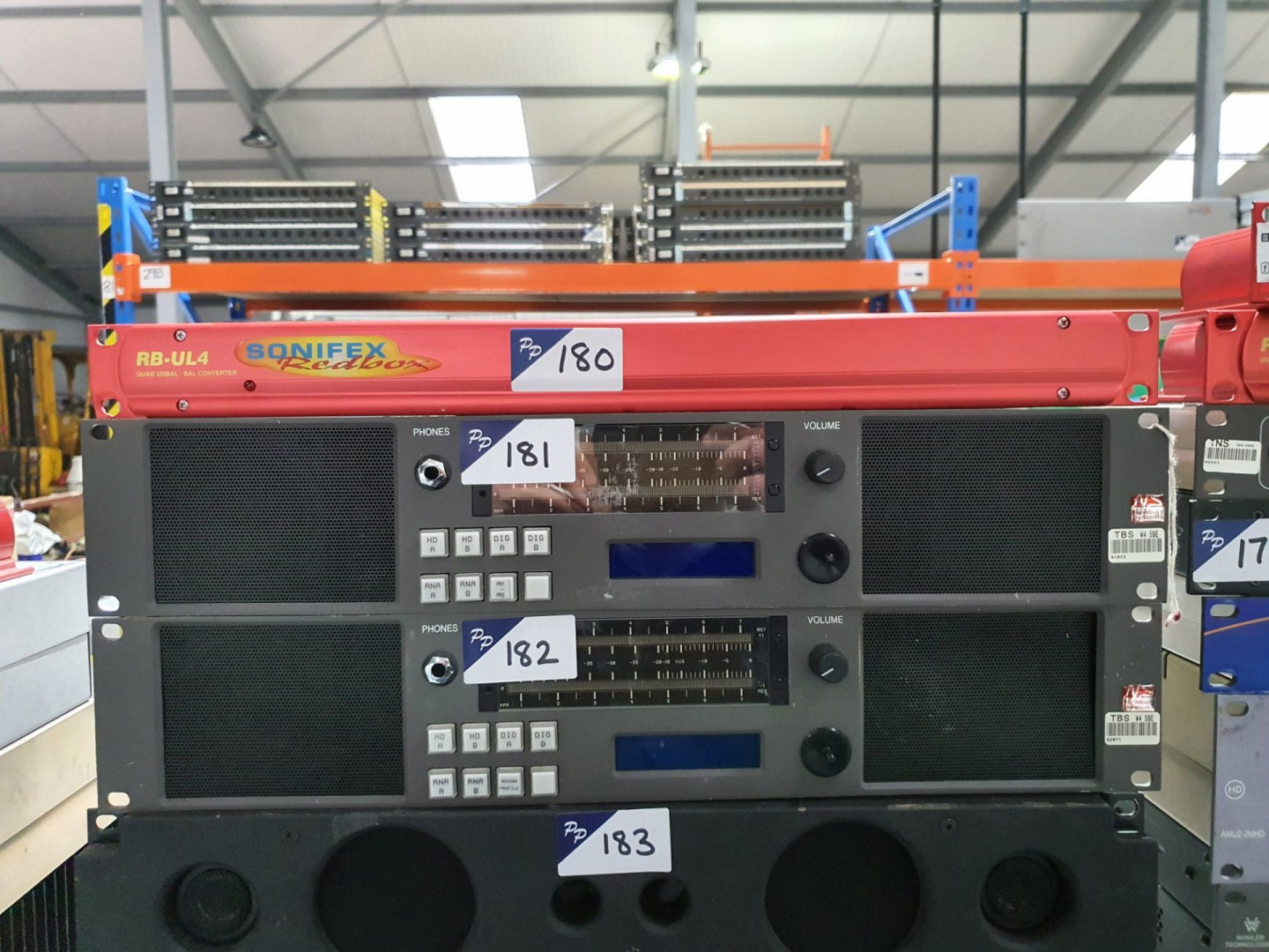 Sony LMD-7220W rack type LCD monitor. Wohler MC-1RU PSU. Qty Sony MEU-WX7 multi-format engine unit & Sony WD-820 UHF antenna divider. Qty Brocade 4GB San switches, blade units, PSUs. 3x rack type fibre patch panels. Qty Nevion Flashlink frame & cards. Qty TSL MDU-12PA, Argosy, ATG etc rack type MDU’s. 4x Penny & Giles 6 fader panels. Pro-Bel TX master control. 8x Dell K07A E-Port docking stations, 3x various miniature speakers. 3x Polycom sound stations, Plantronics conference phone etc, Polycom HDX mic pod. Qty Reggiani LED studio spot light. Quartz CP-1000A controller. Audionics microphone level up controller. BN Broadcast Networks multifunction interface unit. RTS ISDN 2005 IP audio codecs. 2x MRG Systems Data Bridge, ATP600, ATP100. 3x SCT RX7 BSKYB Dsat controller. Gefen CAT5 1000 video-USB-audio senders. Lindy IP access KVM switch. Avaya TN2312BP card. MRV OS-904 fibre switch. 2x Samsung UE26EH4000W LCD TV’s. Pixel Power H154 video switch panel. Qty Pixel Power media servers. Snell Alchemist Ph.C-HD motion compensated HD conversion platform. Various patch panels & various Jack sockets. Kramer SD-7308 serial video switcher, 2x VA2002 multi standard logo generator. 5x Dolby DP571 Dolby E encoders. Qty Soniflex Redbox RB-UL4 Quad unbalance-balance converter. Newbury Systems BGM-2HD rack type audio monitor. Amerging dua II audio interface. IPE IDS squid quad interface unit. TSL AMU2-2MHD & Wolher VMDA-4 audio monitor. Wolher HDCC-9RU power supply. 6x Dolby DP572 Dolby E decoders. Qty Newbury Systems MU2HD-EDM audio monitor. Qty Dolby DP564 multichannel audio decoder. Dolby LM100 broadcast loudness meter. Audionics rack type BKB panel