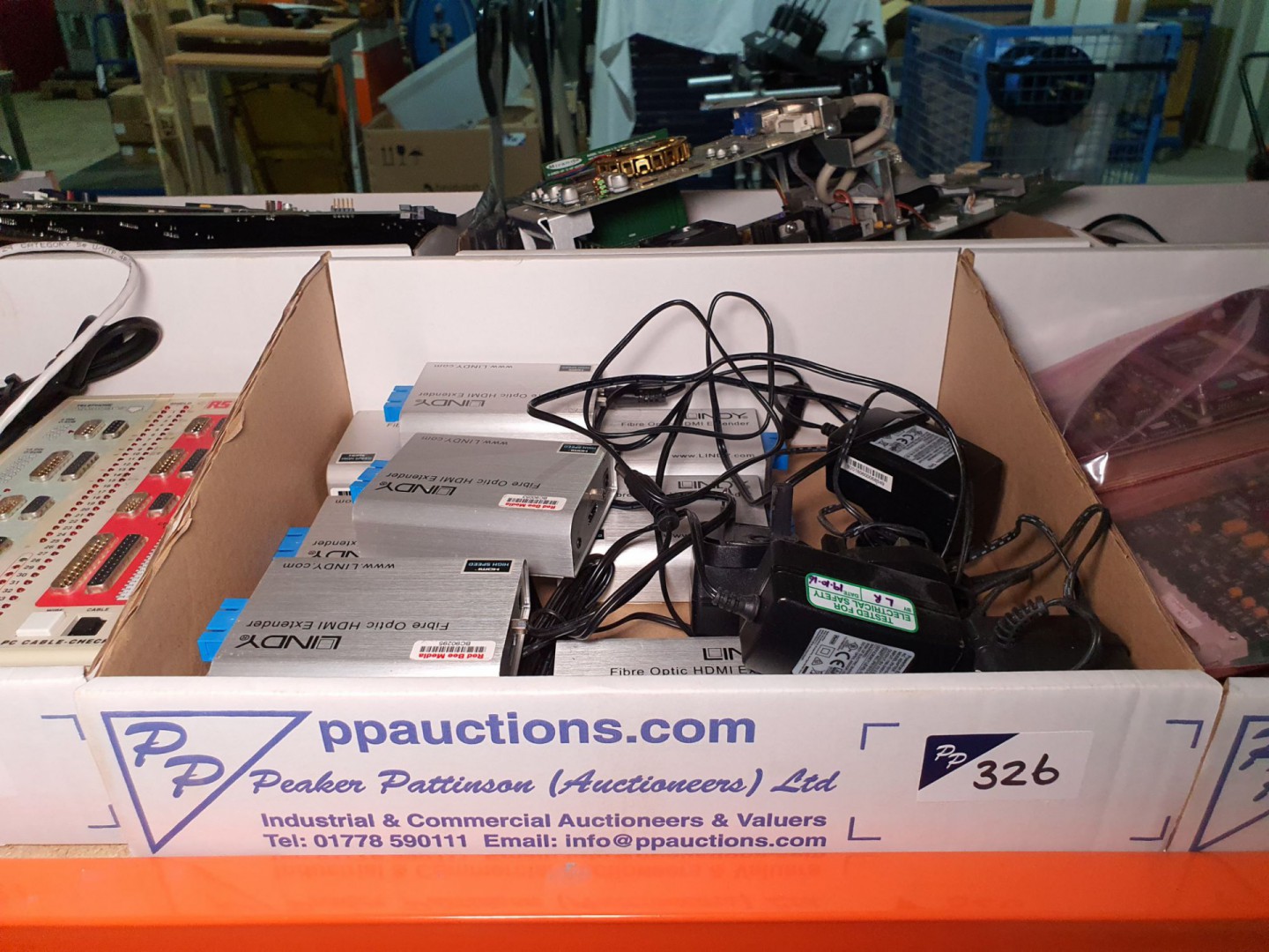 Qty various 240v extension sockets etc. 7x Canford dimmable script lights. Oki C801 colour printer. Tallysman 33-3742-14-01 antenna. Matrox Y7299-02 module. Tandberg DVB S2 demodulator, HP Raid controller, microvideo HDB 300 module. 6x Advanced Micro C264 DVS Centaurus II PCIe cards. Qty Miranda K2 MWi - SDi 4ch SD-SDi input modules.