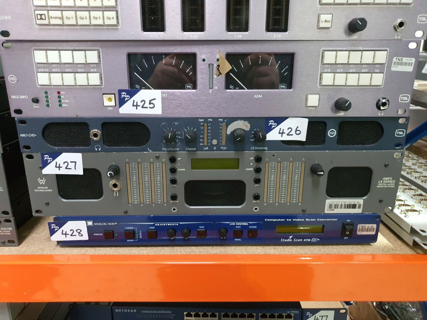 Sony LMD-7220W rack type LCD monitor. Wohler MC-1RU PSU. Qty Sony MEU-WX7 multi-format engine unit & Sony WD-820 UHF antenna divider. Qty Brocade 4GB San switches, blade units, PSUs. 3x rack type fibre patch panels. Qty Nevion Flashlink frame & cards. Qty TSL MDU-12PA, Argosy, ATG etc rack type MDU’s. 4x Penny & Giles 6 fader panels. Pro-Bel TX master control. 8x Dell K07A E-Port docking stations, 3x various miniature speakers. 3x Polycom sound stations, Plantronics conference phone etc, Polycom HDX mic pod. Qty Reggiani LED studio spot light. Quartz CP-1000A controller. Audionics microphone level up controller. BN Broadcast Networks multifunction interface unit. RTS ISDN 2005 IP audio codecs. 2x MRG Systems Data Bridge, ATP600, ATP100. 3x SCT RX7 BSKYB Dsat controller. Gefen CAT5 1000 video-USB-audio senders. Lindy IP access KVM switch. Avaya TN2312BP card. MRV OS-904 fibre switch. 2x Samsung UE26EH4000W LCD TV’s. Pixel Power H154 video switch panel. Qty Pixel Power media servers. Snell Alchemist Ph.C-HD motion compensated HD conversion platform. Various patch panels & various Jack sockets. Kramer SD-7308 serial video switcher, 2x VA2002 multi standard logo generator. 5x Dolby DP571 Dolby E encoders. Qty Soniflex Redbox RB-UL4 Quad unbalance-balance converter. Newbury Systems BGM-2HD rack type audio monitor. Amerging dua II audio interface. IPE IDS squid quad interface unit. TSL AMU2-2MHD & Wolher VMDA-4 audio monitor. Wolher HDCC-9RU power supply. 6x Dolby DP572 Dolby E decoders. Qty Newbury Systems MU2HD-EDM audio monitor. Qty Dolby DP564 multichannel audio decoder. Dolby LM100 broadcast loudness meter. Audionics rack type BKB panel