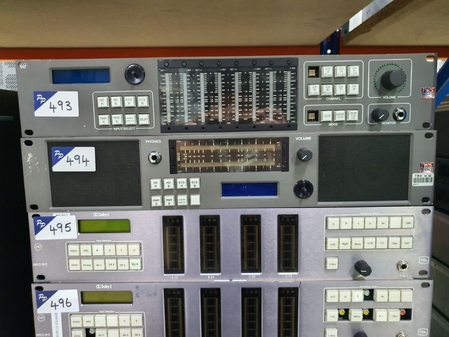Behringer A500 reference amplifier. TSL AMU9-CHD+ audio monitor. 2x Dolby DP570 multichannel audio tool. Pro-Bel 6712 & Pro-Bel 6276/6277 controller. Sony MB-8N tuner base unit. Wohler AMP1-DA/106 digital audio monitor panel