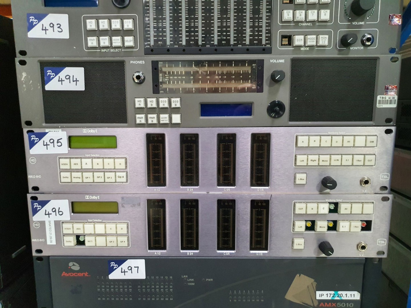 Behringer A500 reference amplifier. TSL AMU9-CHD+ audio monitor. 2x Dolby DP570 multichannel audio tool. Pro-Bel 6712 & Pro-Bel 6276/6277 controller. Sony MB-8N tuner base unit. Wohler AMP1-DA/106 digital audio monitor panel