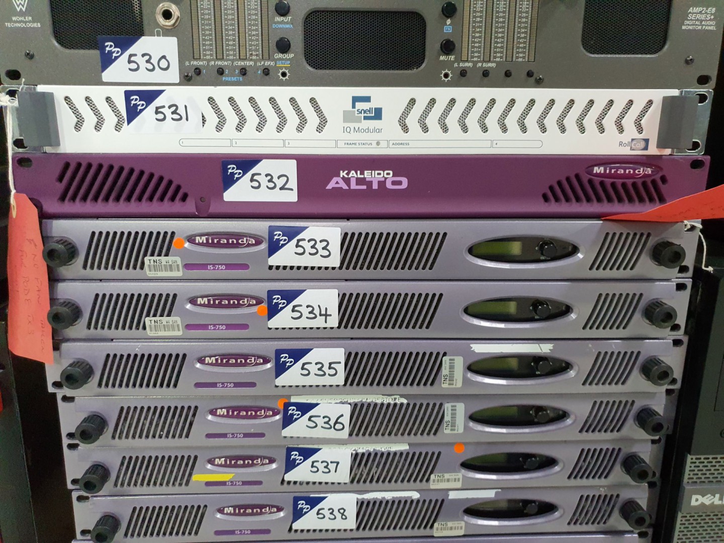 Miranda MWR-4B 4BNC/S video Miranda MWR-HD rear module. Qty various Dell OptiPlex, HP etc workstations, laptops & monitors. Qty various Evertz rear & front modules. Qty various patch panels inc: Argosy, ATG etc. Qty Avnet, Sony etc PSU & fans. Miranda Oxtel RCP consol. Miranda Kaleido-RCP, Miranda Kaleido-Solo KS900. 9x Lindy fibre optic HDMI extender receivers. JVC DT-E17L4G, DT-R17L4D, DT-R17L4D multi format LCD monitor. 2x HP TFT7600 monitor, keyboard. Qty Apple A1082 LCD HD cinema display & Apple A1186 base unit. Qty Canford 76-361 powered speakers. 2x Evertz 2430DAC Glink D to A converter. Grass Valley CP-3832 & CP-3800A control panel. Quartz CP-1000A control panels. Leitch ADC-5108-L slave studio clock. 3x Belkin Soho FIDD104L KVM switch. Wasp WPL305E barcode printer.